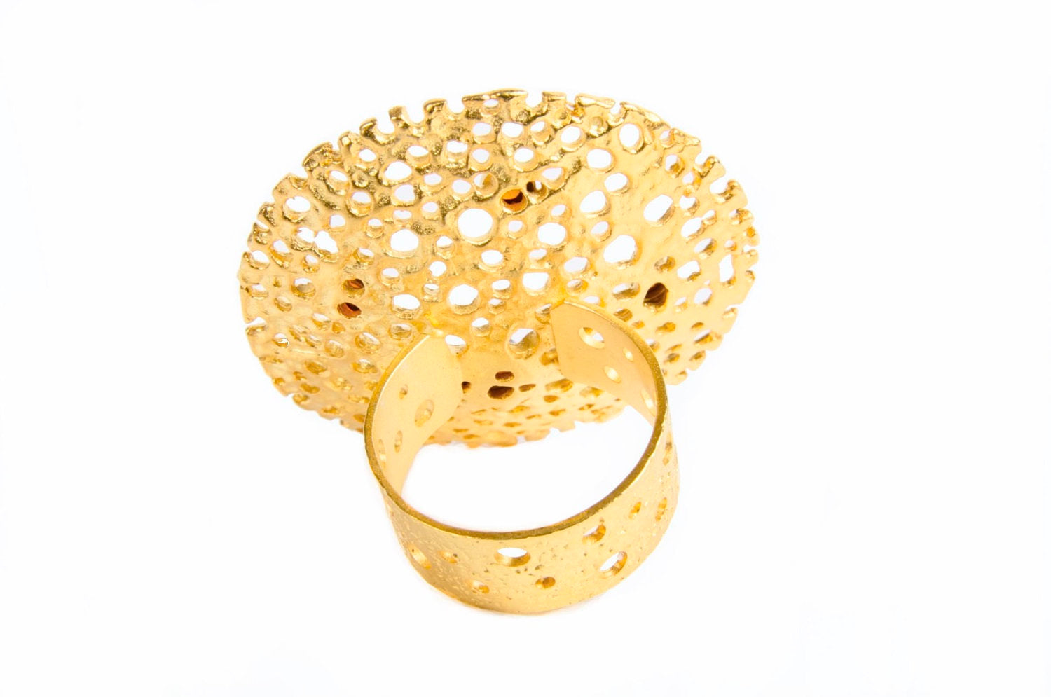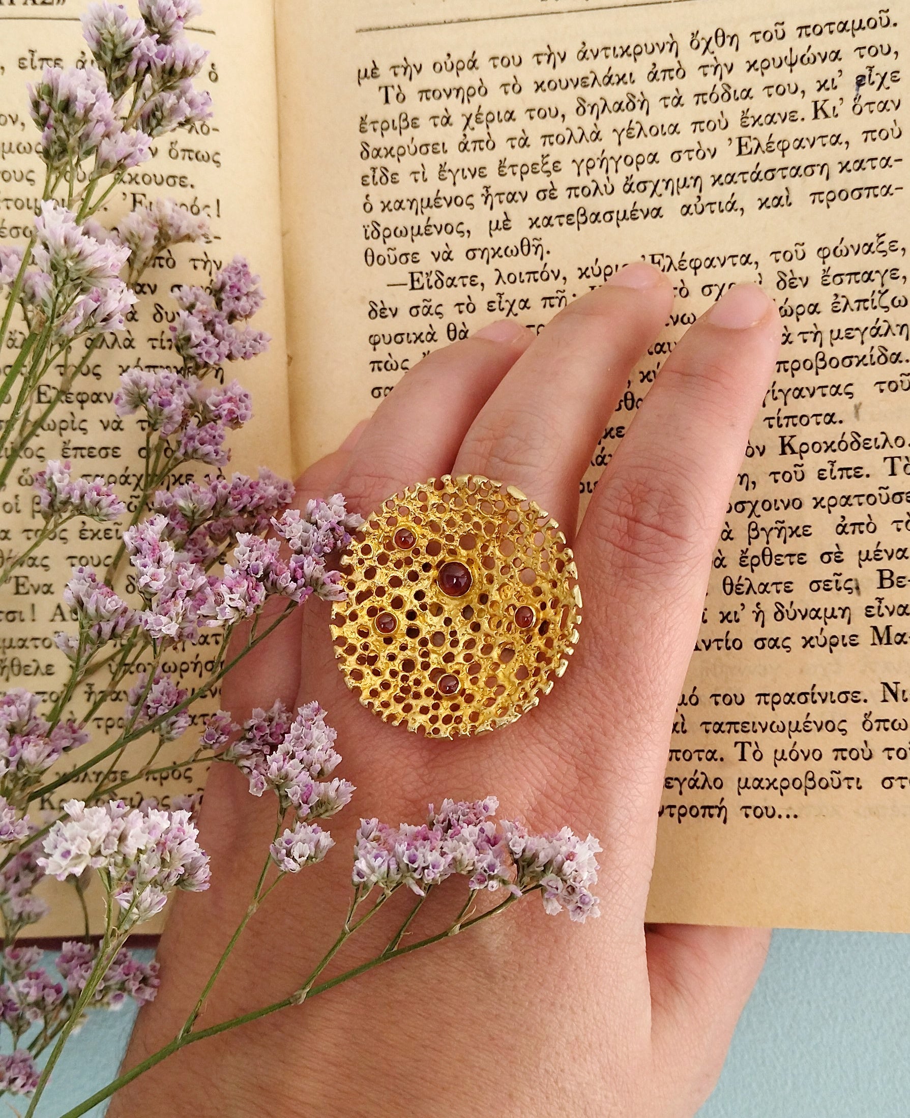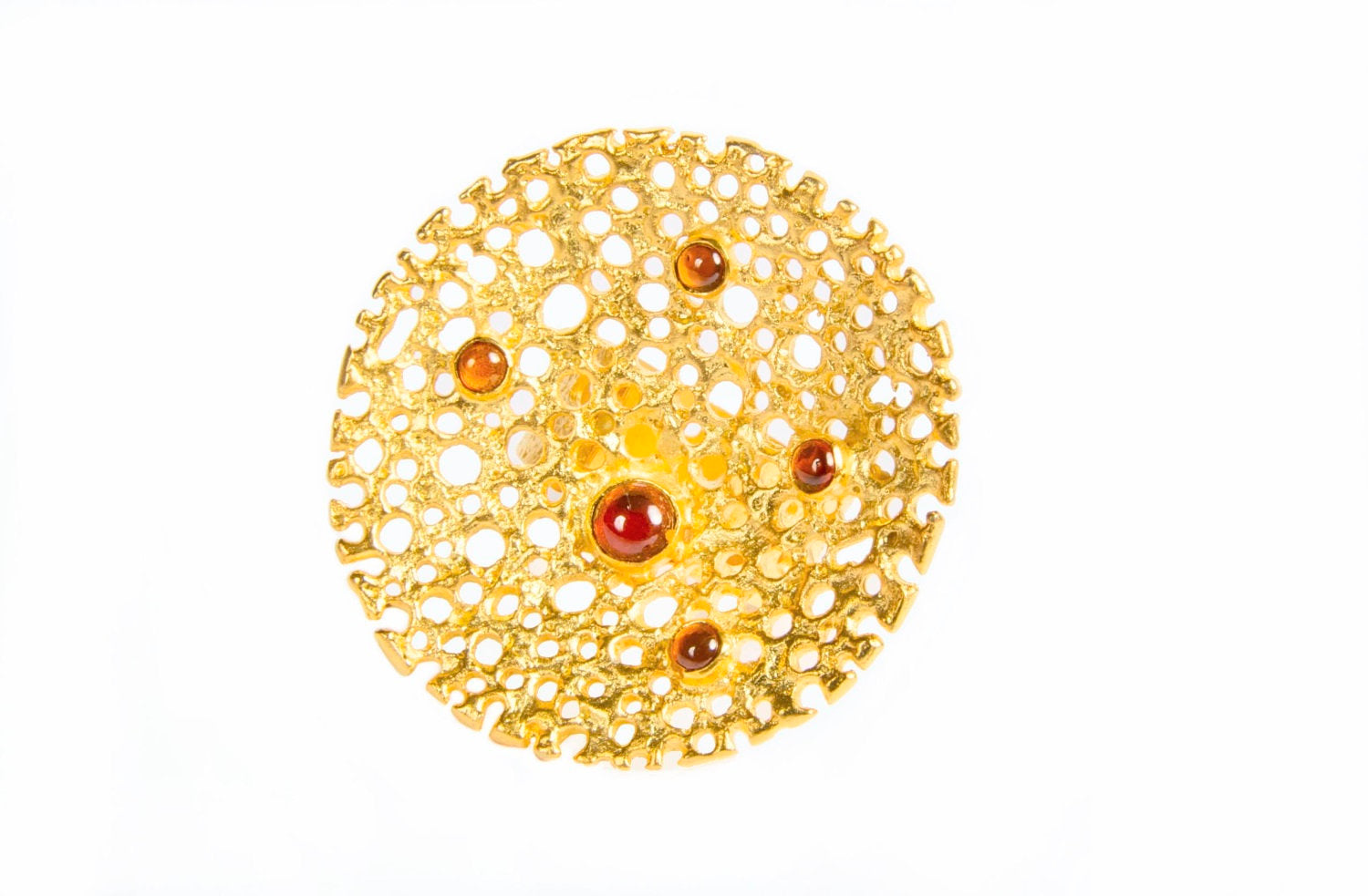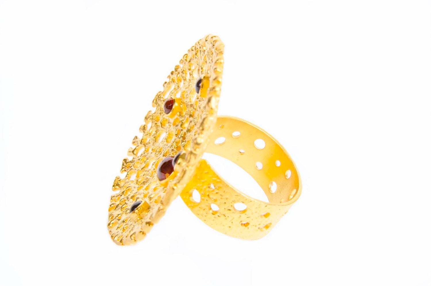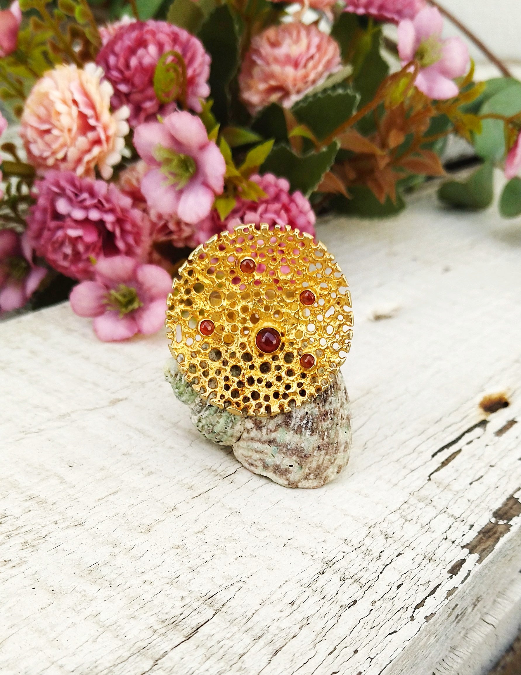 Εντυπωσιακό δαχτυλίδι σε σχήμα δίσκου με 5 υπέροχες πέτρες κορνεόλης σε ζεστό πορτοκαλί χρώμα. Φτιαγμένο από μασίφ ασήμι, επιχρυσωμένο με χρυσό 22 καρατίων. Ενα και μοναδικό κομμάτι για μια και μοναδική γυναίκα!