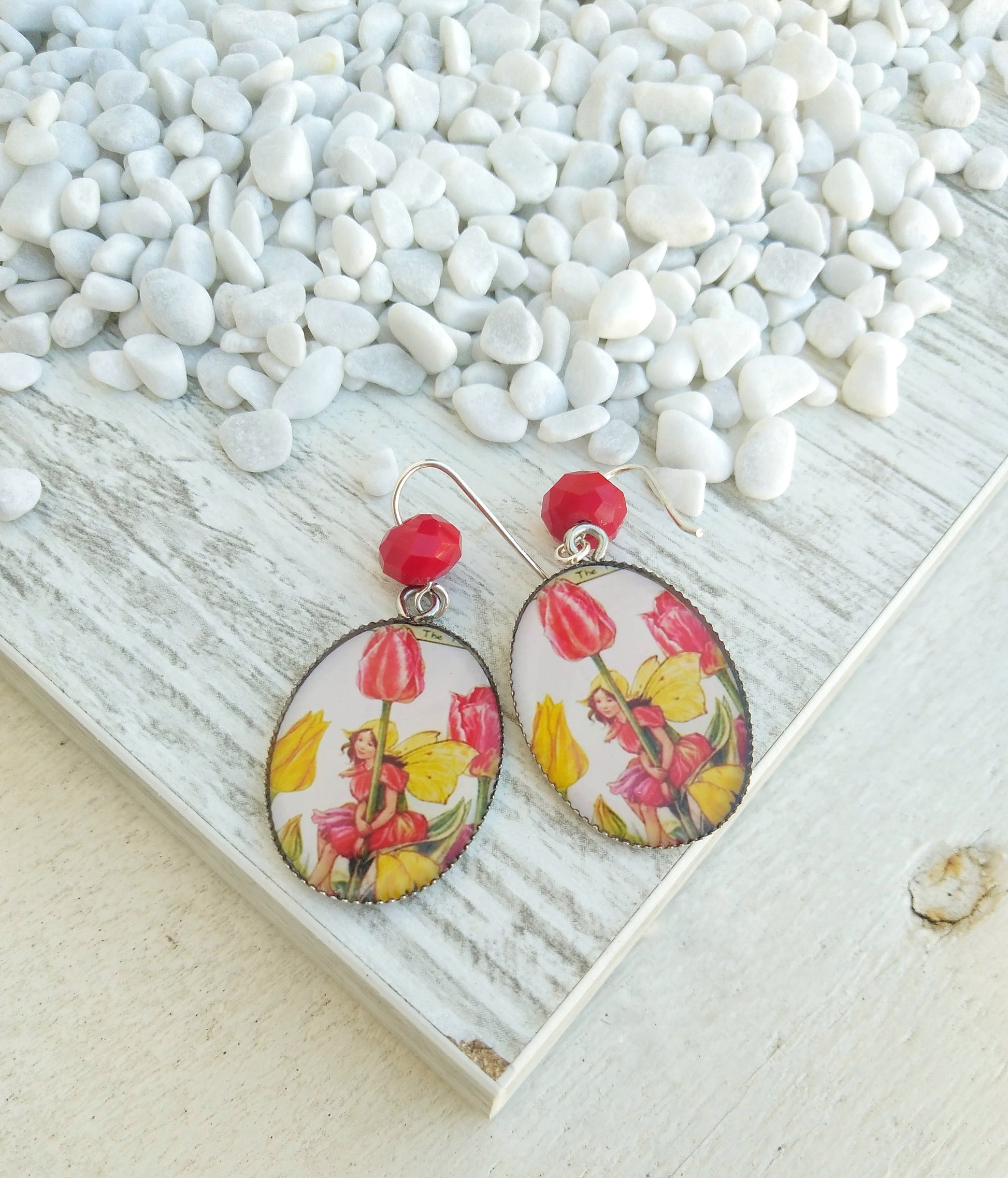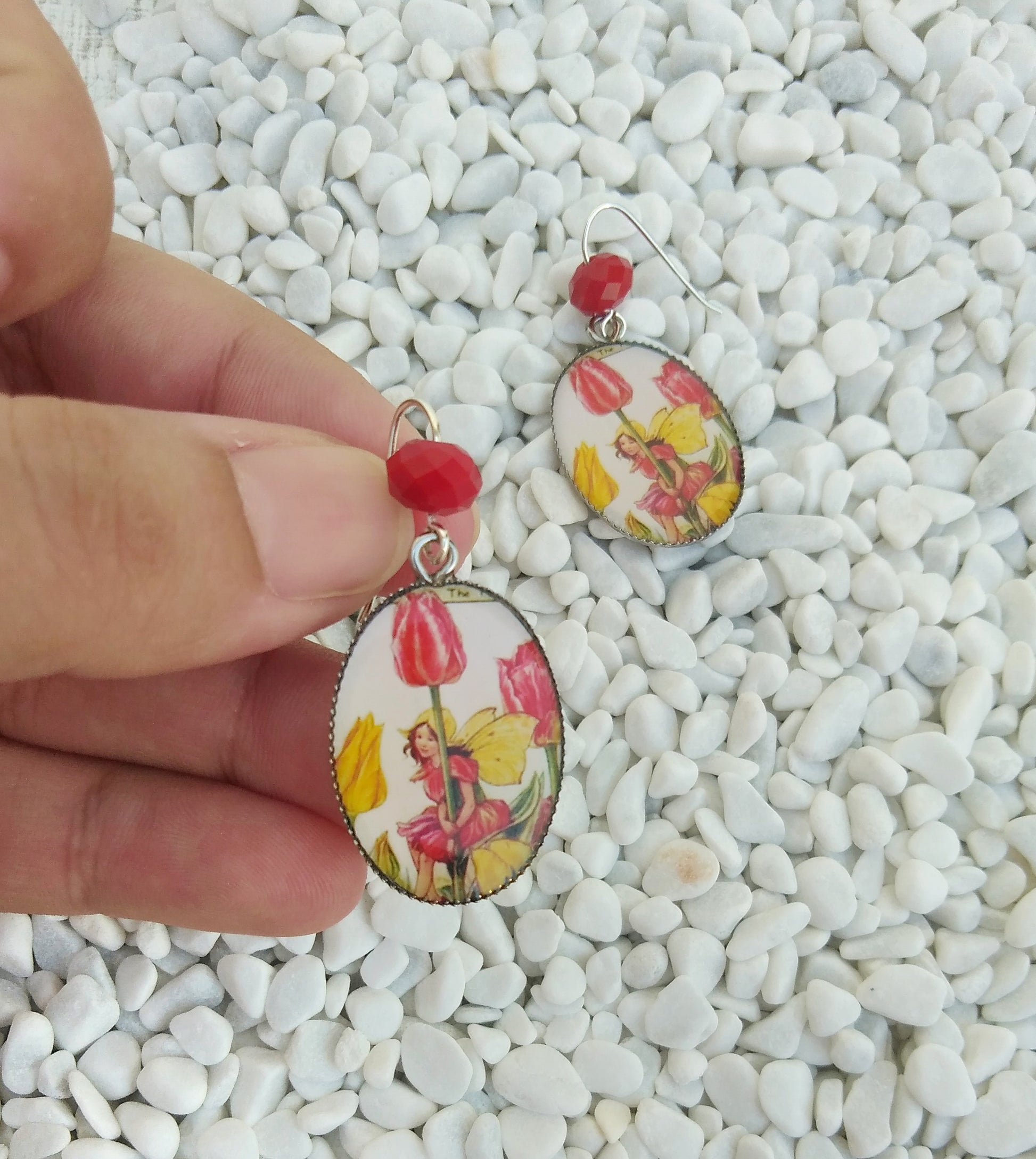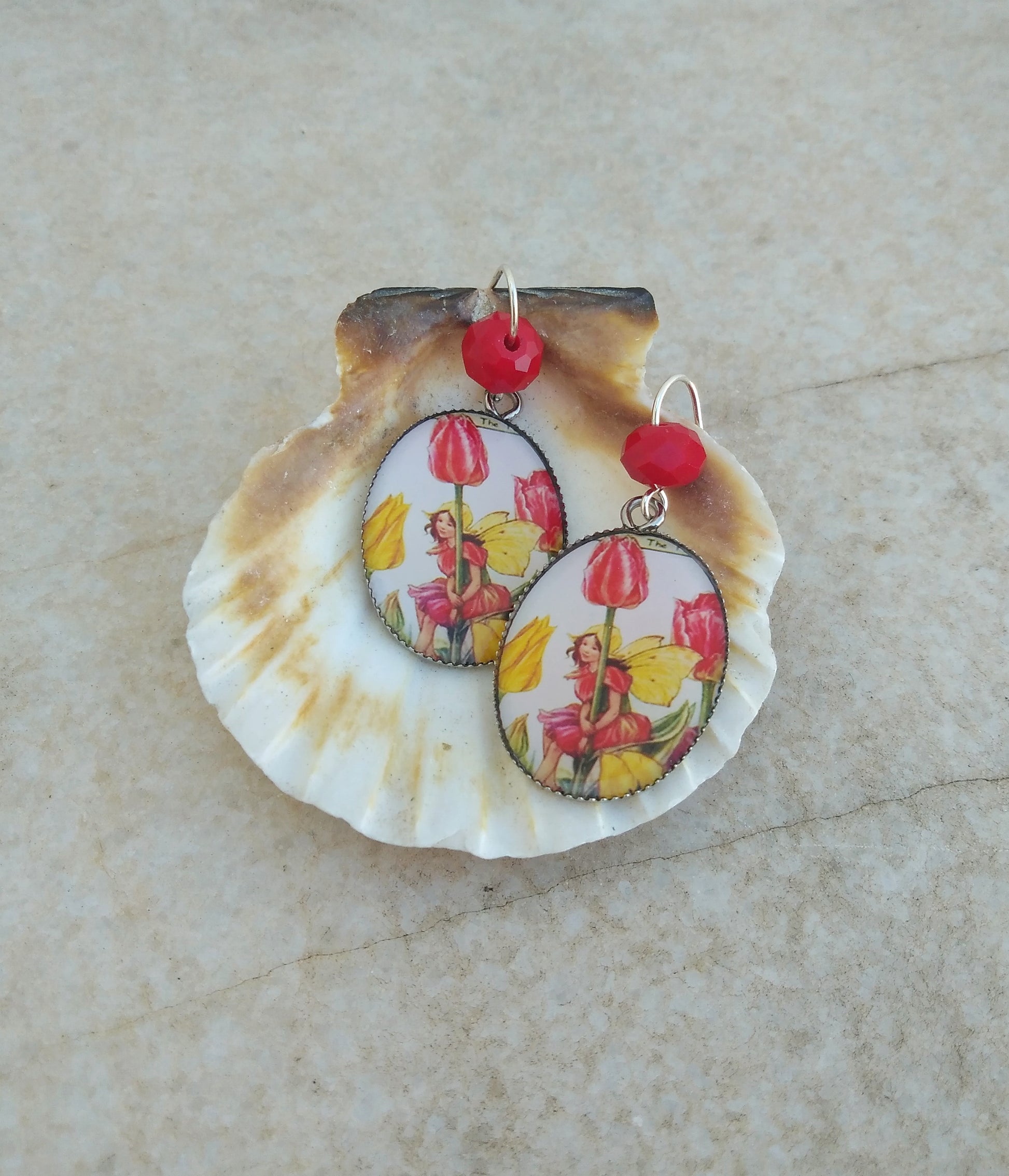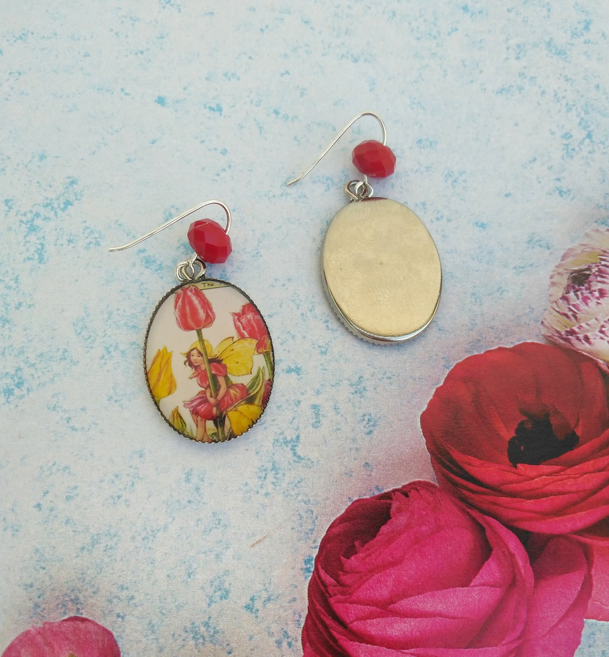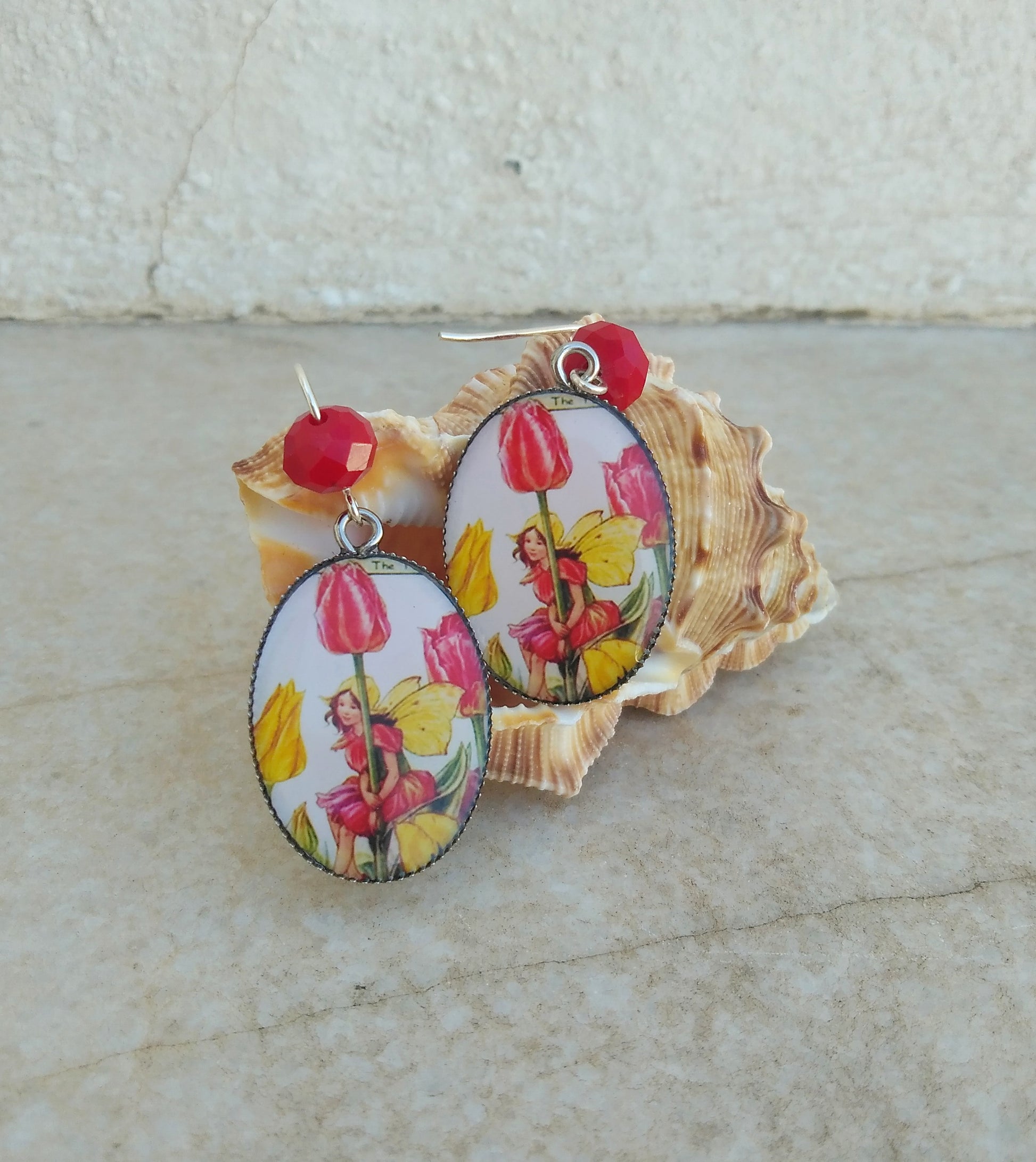 Αξιολάτρευτα σκουλαρίκια νεράιδα της τουλίπας. Φτιαγμένα από επαργυρωμένο ορείχαλκο και ασήμι και εμπνευσμένα από τα σχέδια ενός παιδικού βιβλίου της Cicely Mary Barker.