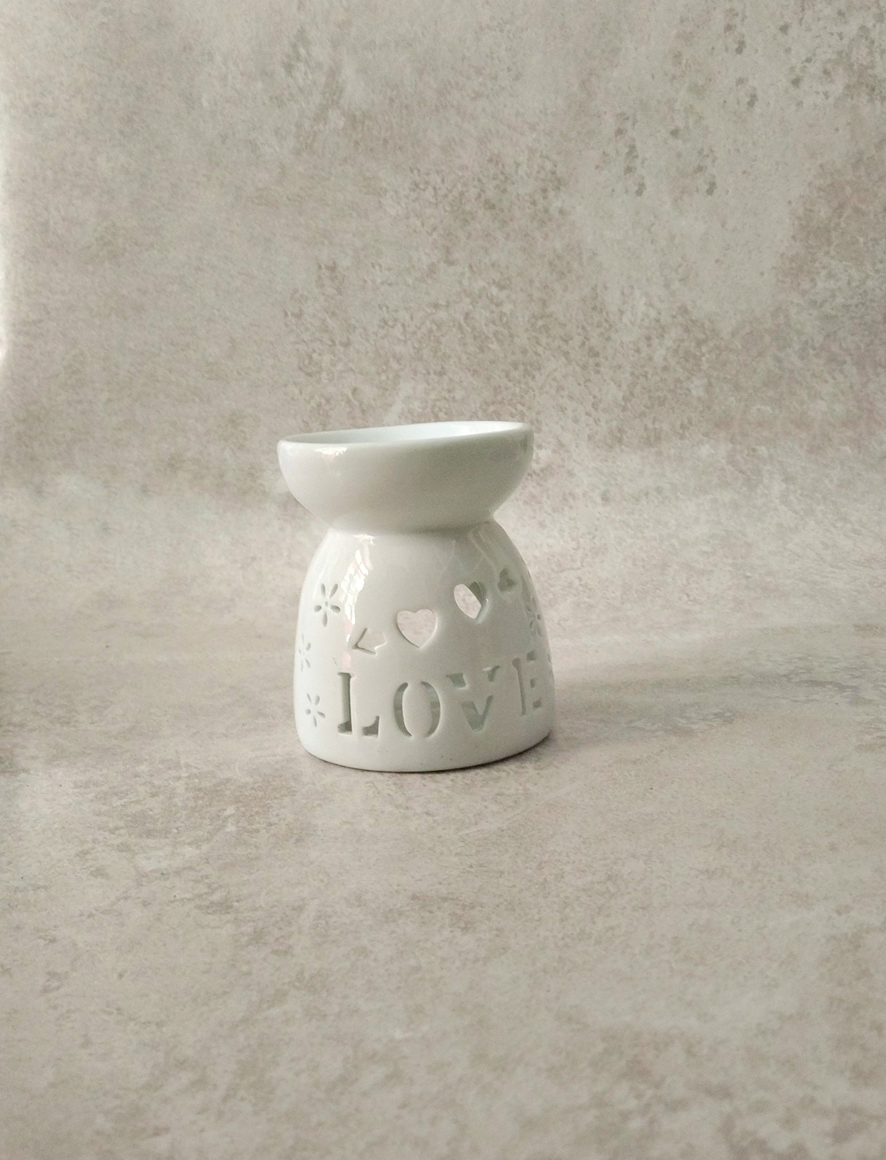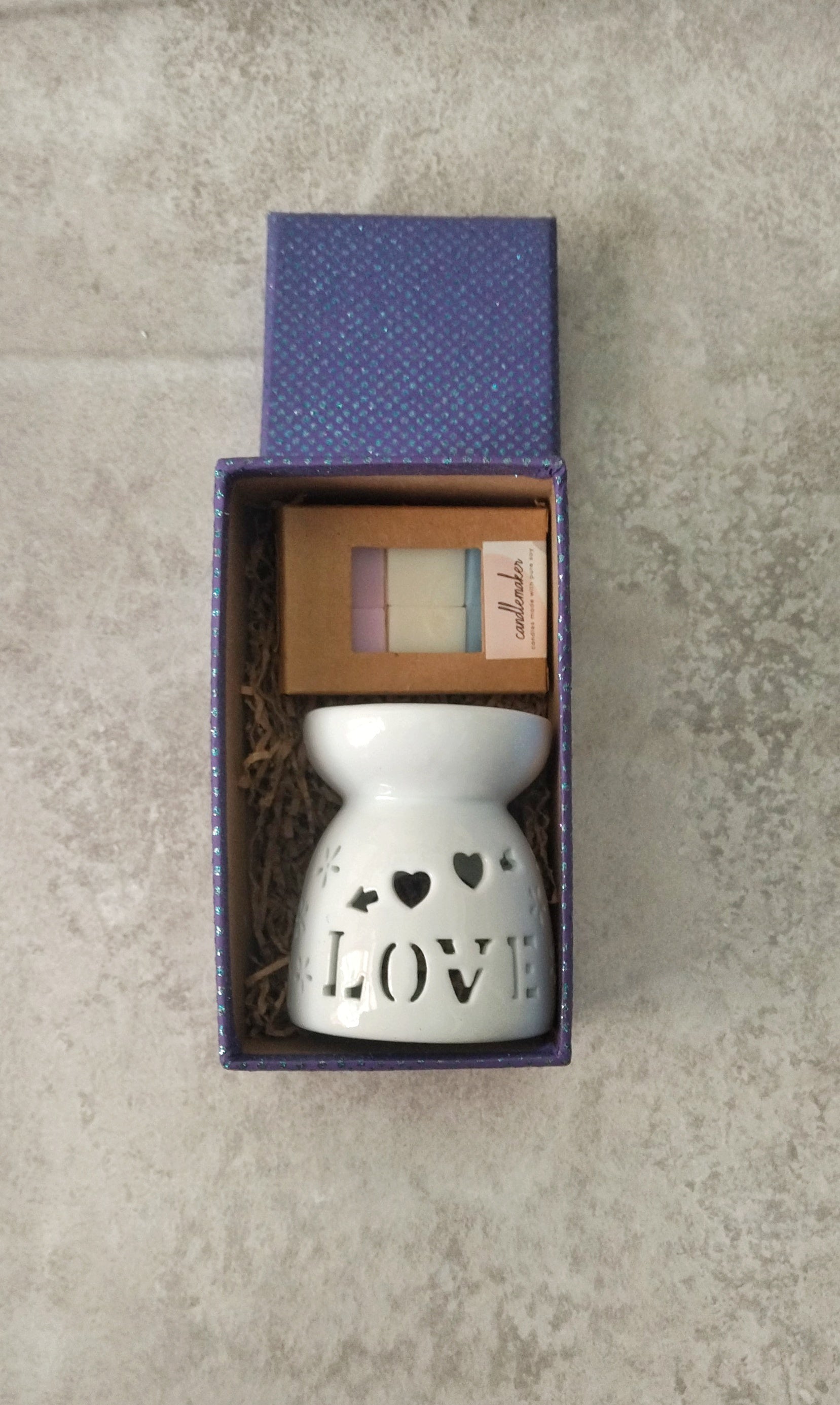 Υπέροχο κουτί δώρου με λευκό κεραμικό αρωματιστή σε μικρό μέγεθος με τη λέξη "LOVE" και ένα κουτί με λαχταριστά αρωματικά wax melts. Το σετ περιλαμβάνει έναν αρωματιστή σε λευκό χρώμα, ένα κουτί με wax melts σε άρωμα που επιθυμείτε και 2 κεράκια ρεσό. ❊Μέγεθος αρωματιστή: 9.5 x 8 εκατοστά. ❊ Αν και οι μυρωδιές των wax melt μας είναι λαχταριστές, δεν είναι για φάγωμα επομένως μην παροσπαθήσετε να τα δοκιμάσετε. ❊Κρατήστε τον αρωματιστή μακρυά από παιδιά και ζωάκια ❊ Μην τοποθετείτε τον αρωματιστή αναμμένο κοντά σε εύφλεκτα αντικείμενα. ❊ Αφήστε τον αρωματιστή να κρυώσει εντελώς πριν τον ξαναχρησιμοποιήσετε. ❊ Μην χρησιμοποιείτε μεταλλικά αντικείμενα για να αφαιρέσετε το κερί από τον αρωματιστή. ❊ Μην αφήνετε τον αρωματιστή να καίει πάνω από 4 συνεχόμενες ώρες.