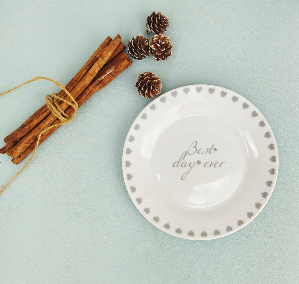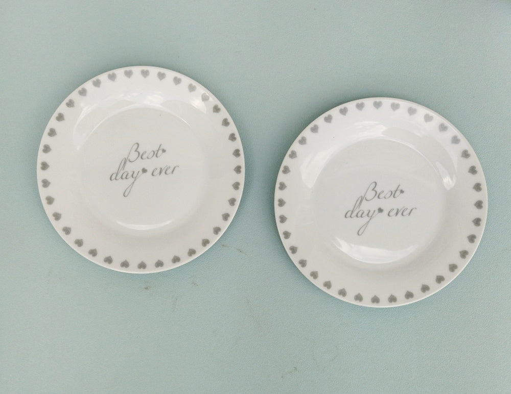 2 γλυκύτατα πορσελάνινα πιατάκια με μπορντούρα καρδούλες. Στο εσωτερικό του πιάτου είναι ζωγραφισμένη η φράση Best Day Ever (η καλύτερη μέρα του κόσμου). Ιδανικό για τη γαμήλια δεξίωση, σαν πιάτα του γαμπρού και της νύφης ή σαν πιατάκι για την γαμίλια τούρτα τους.