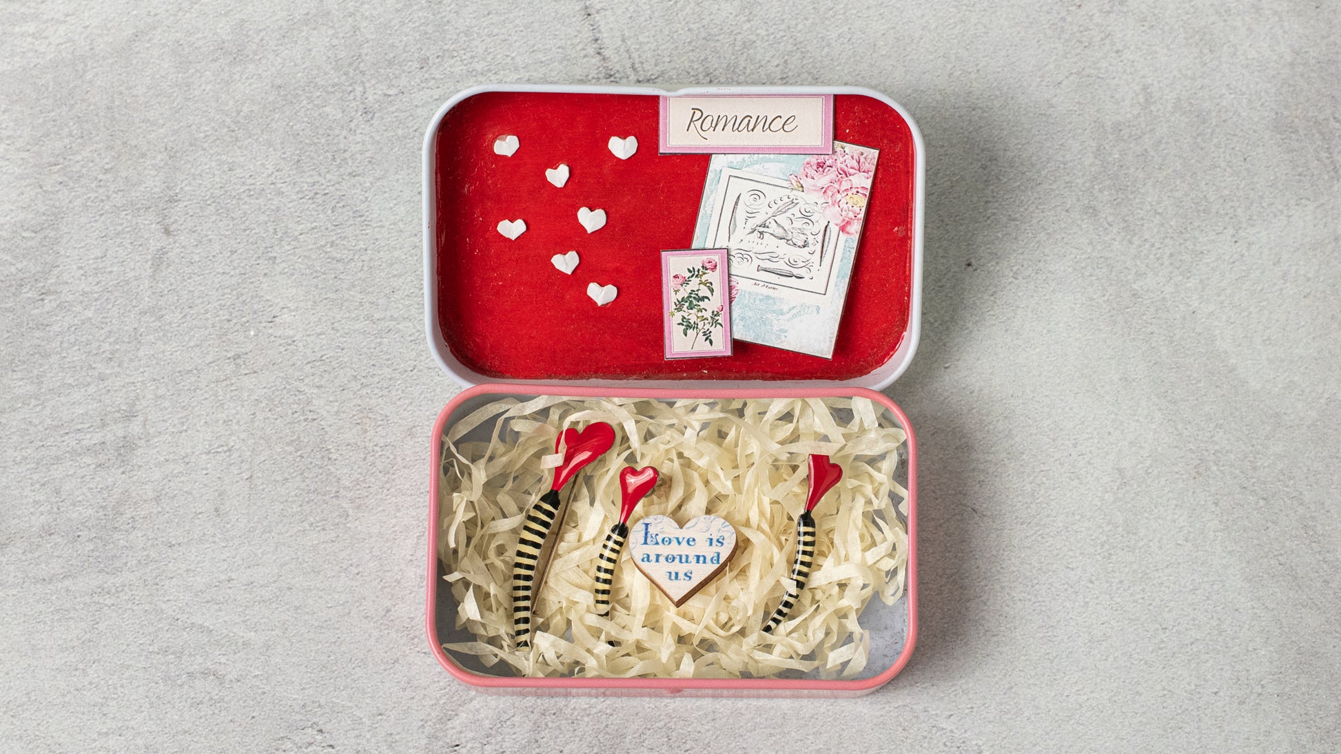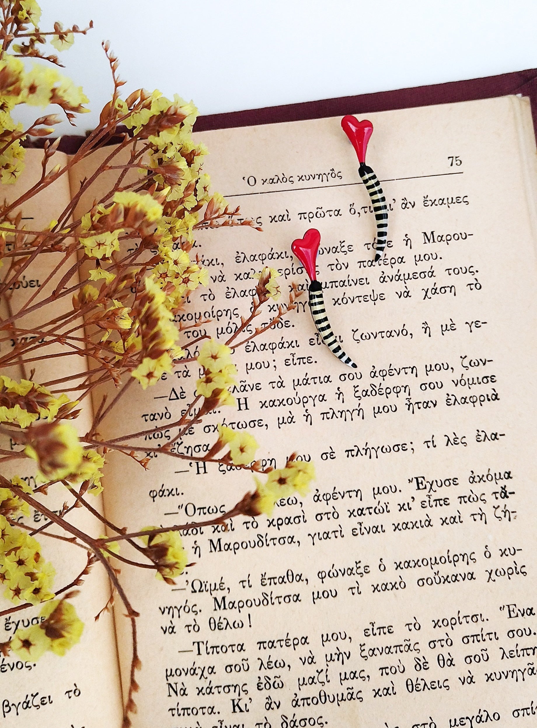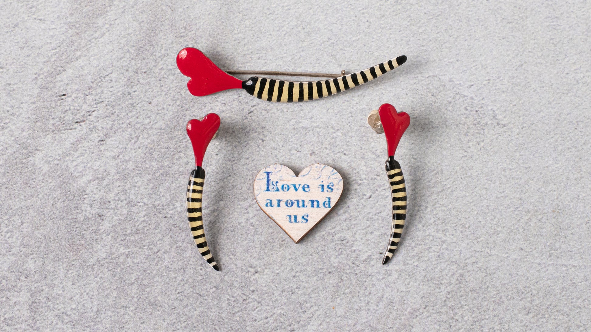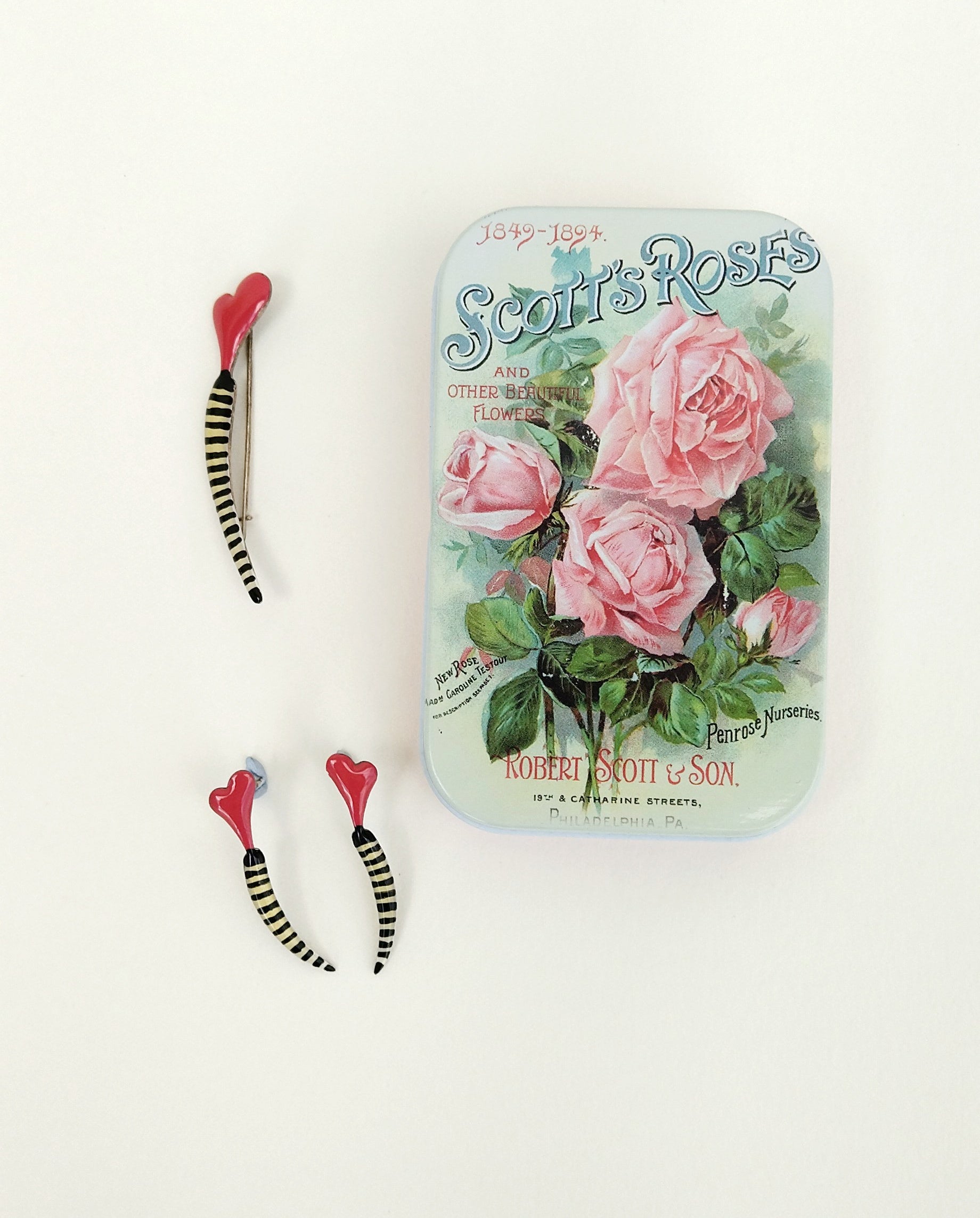 A unique love gift! A pair of stud earrings with a bright red heart and a matching brooch. You ll receive them inside a beautiful tin box, painted and decorated entirely by hand. (You will also find inside a few surprises!!)