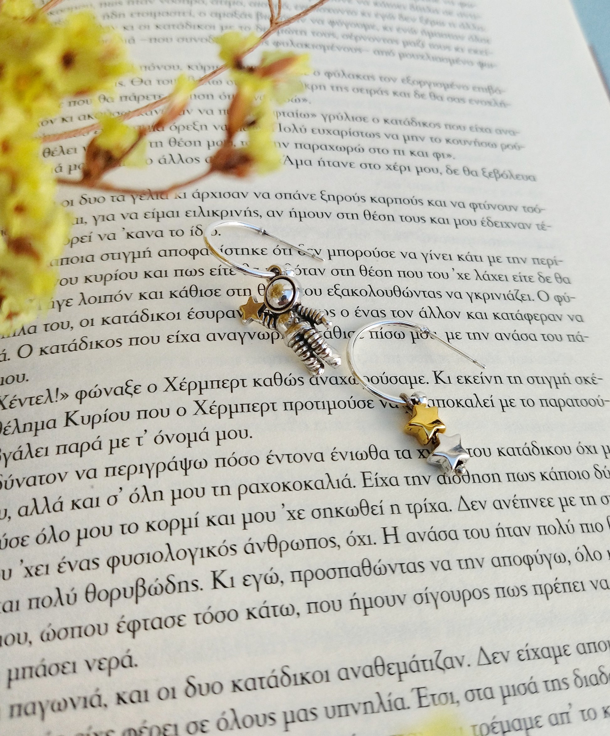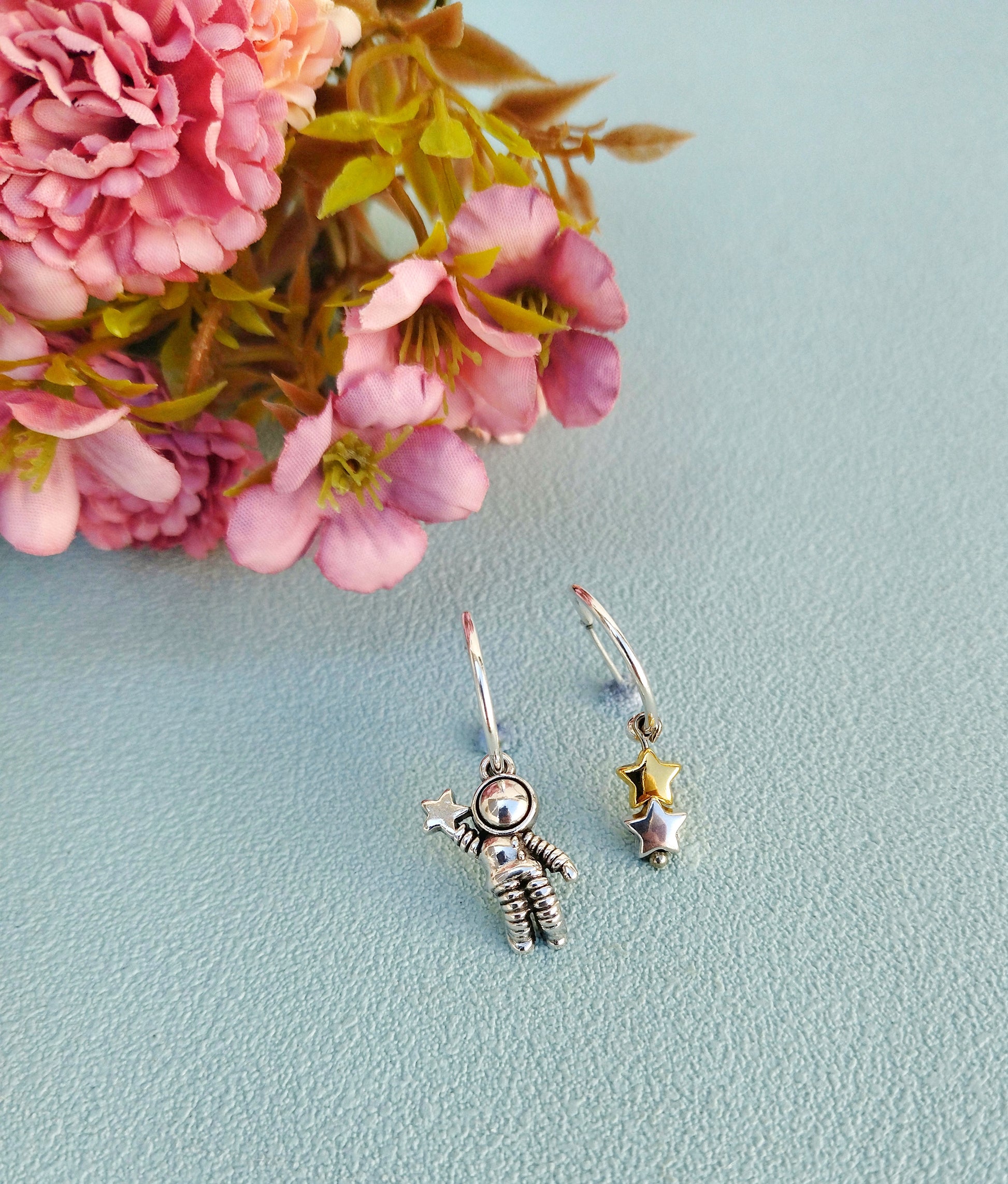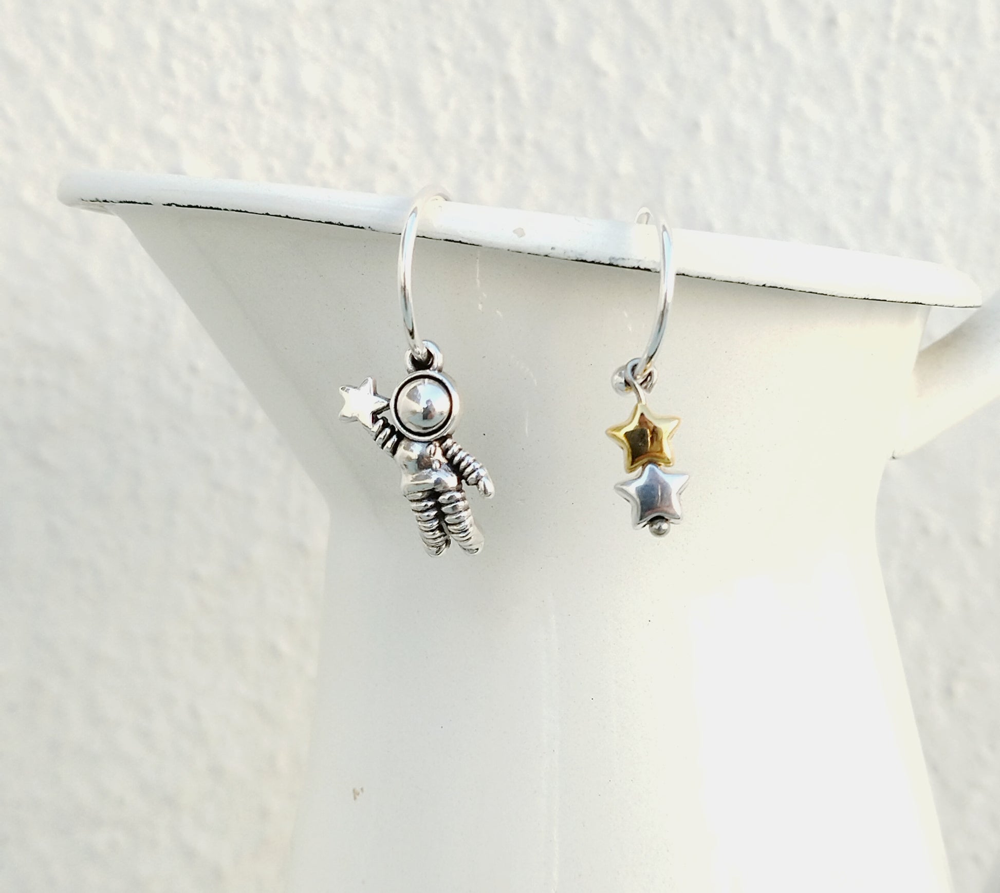Cute astronaut and star small hoop earrings. You want a pair of lightweight huggie hoops, beautiful but also discreet in order to enjoy it all day long? Never to take it off you? Mismatched earrings is our sweet spot, I love the fact that they are different one pair to another... Perfect celestial piece of jewellery for this special girl in your life in order to say: "I love you to the moon and back.."! Or a nice idea as your science teacher gift.