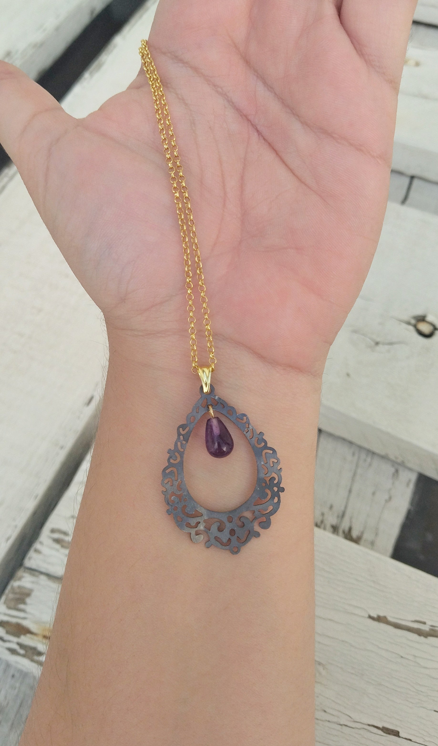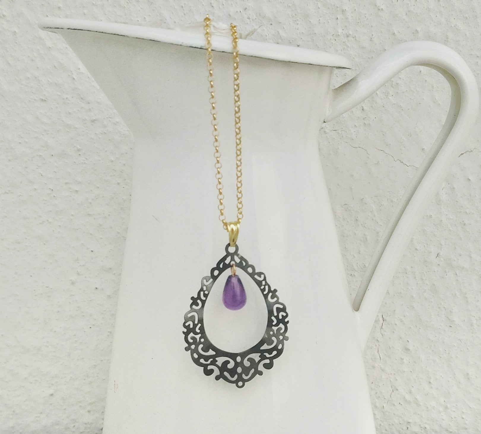 Elegant black filigree necklace for women with sparkling teardrop gemstone. Fanning out in a pretty pattern of deep black this black anthracite piece of jewelry is dramatic and powerful. Within its center a brilliant purple amethyst glows with the fire of the earth.