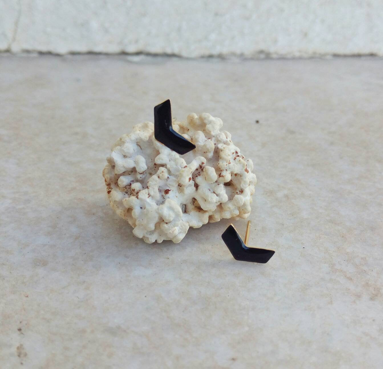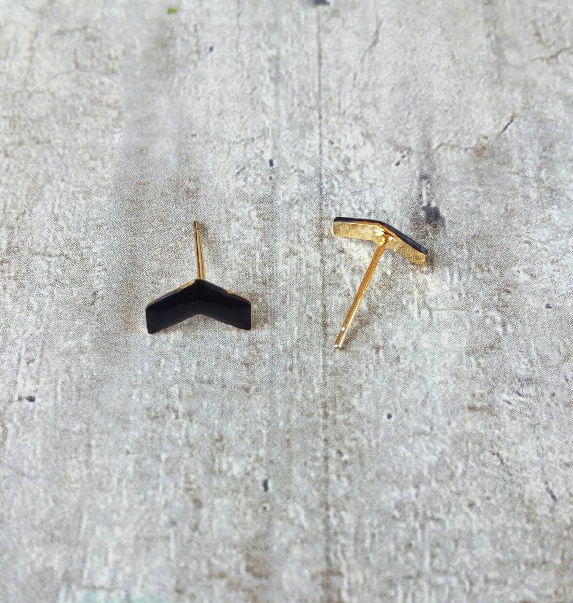 Black geometric earrings made of bronze. Our chevron earrings are cute, modern and funny! A pair of nickel free earrings, lead and cadmium free. Perfect everyday jewelry, easy to match with all your outfits. Ideal as second hole studs both for men and women! It comes to you on our eco friendly wood stand and in our original package, ready to be gifted.*A nice layer of resin has been brushed on top of the enamel in order to protect the colors.
