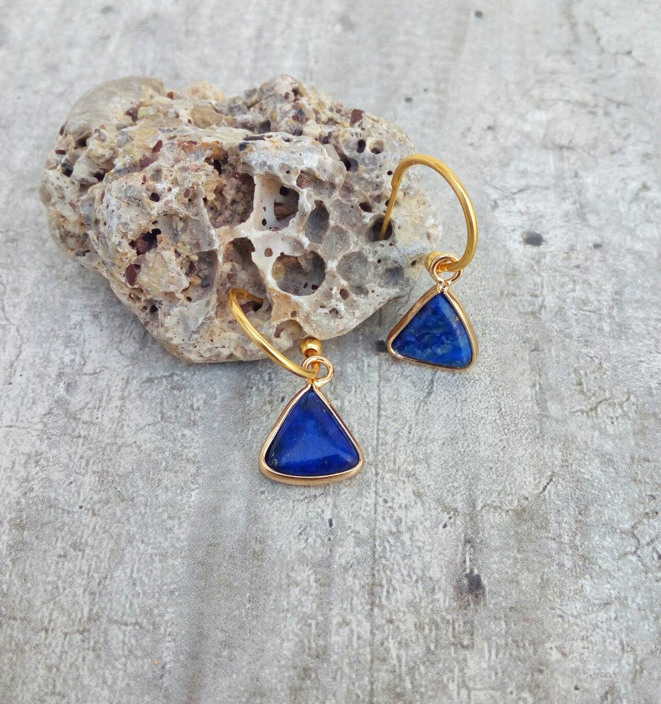 Blue hoop earrings made of gold plated bronze and stainless steel. Simple and beautiful, these cobalt blue earrings are adorned with a lapis lazuli charm. Nickel, lead and cadmium free, thing that makes them the perfect hypoallergenic hoops for every woman! Ideal as navy blue bridesmaid jewelry!!