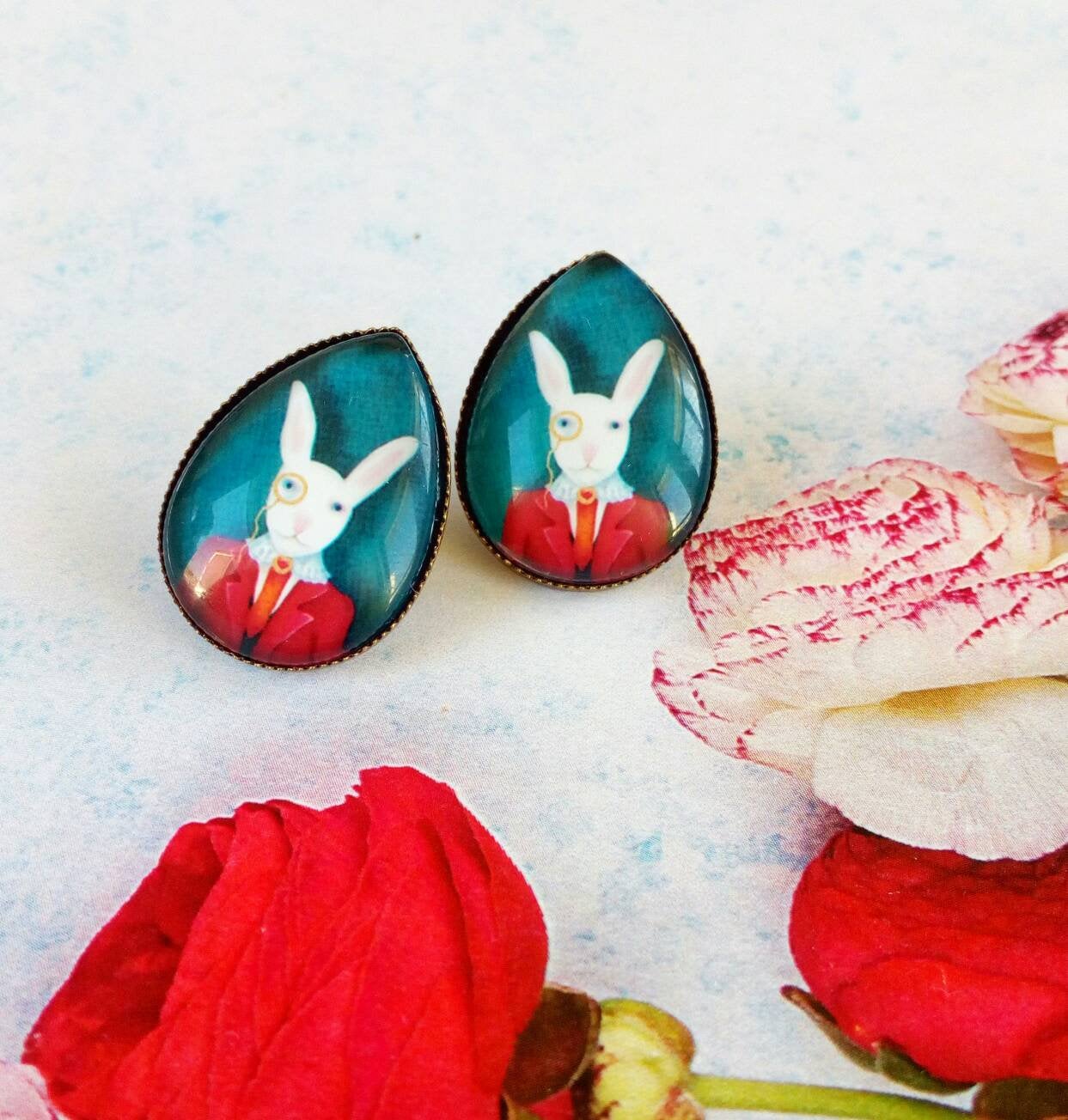 We introduce you our quirky bunny earrings! A unique piece of anthropomorphic art jewelry. An adorable rabbit with monocle pair of earrings, a renaissance pet with personality!! The perfect bunny lover gift!