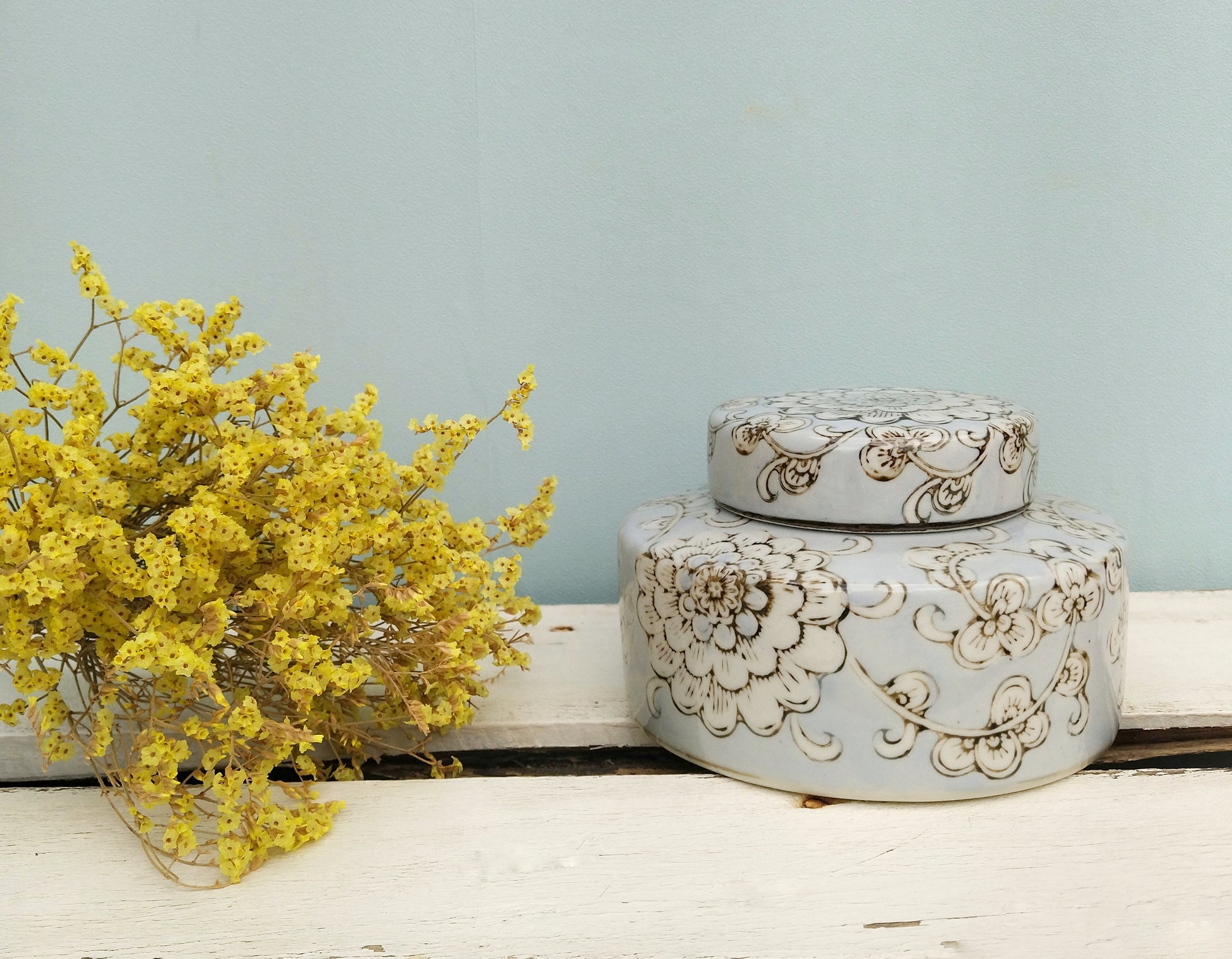 Ceramic Jar With Lid, Handmade Peony Flower Jar