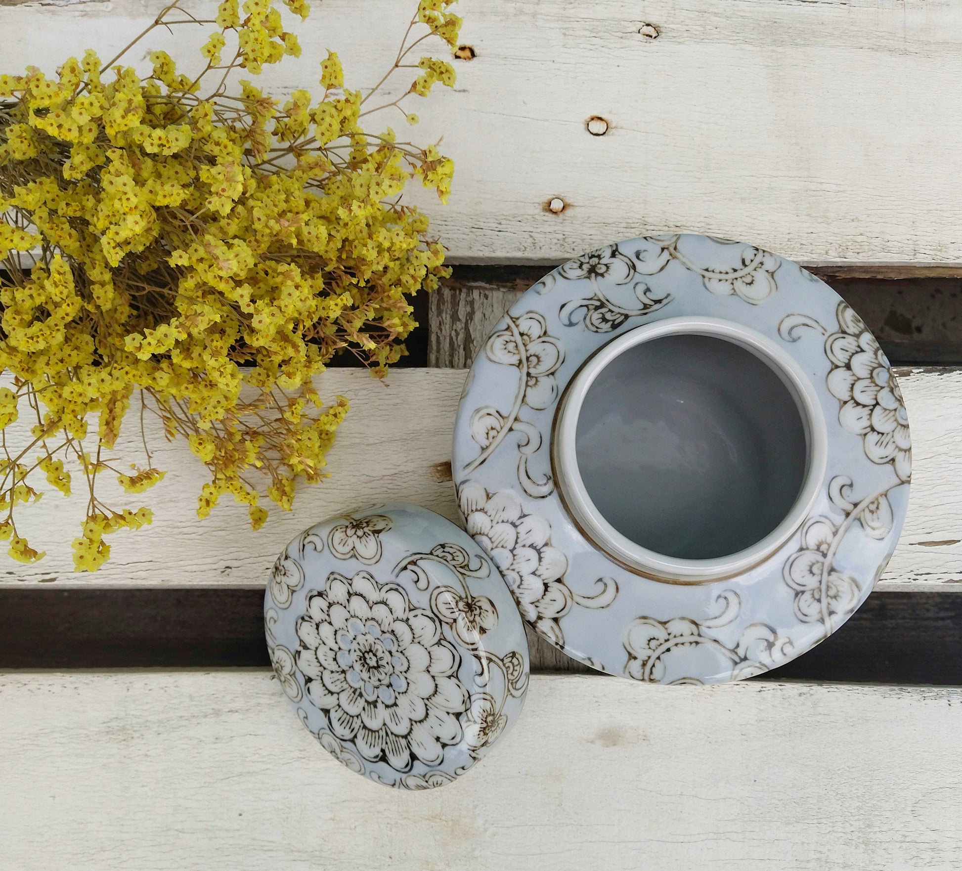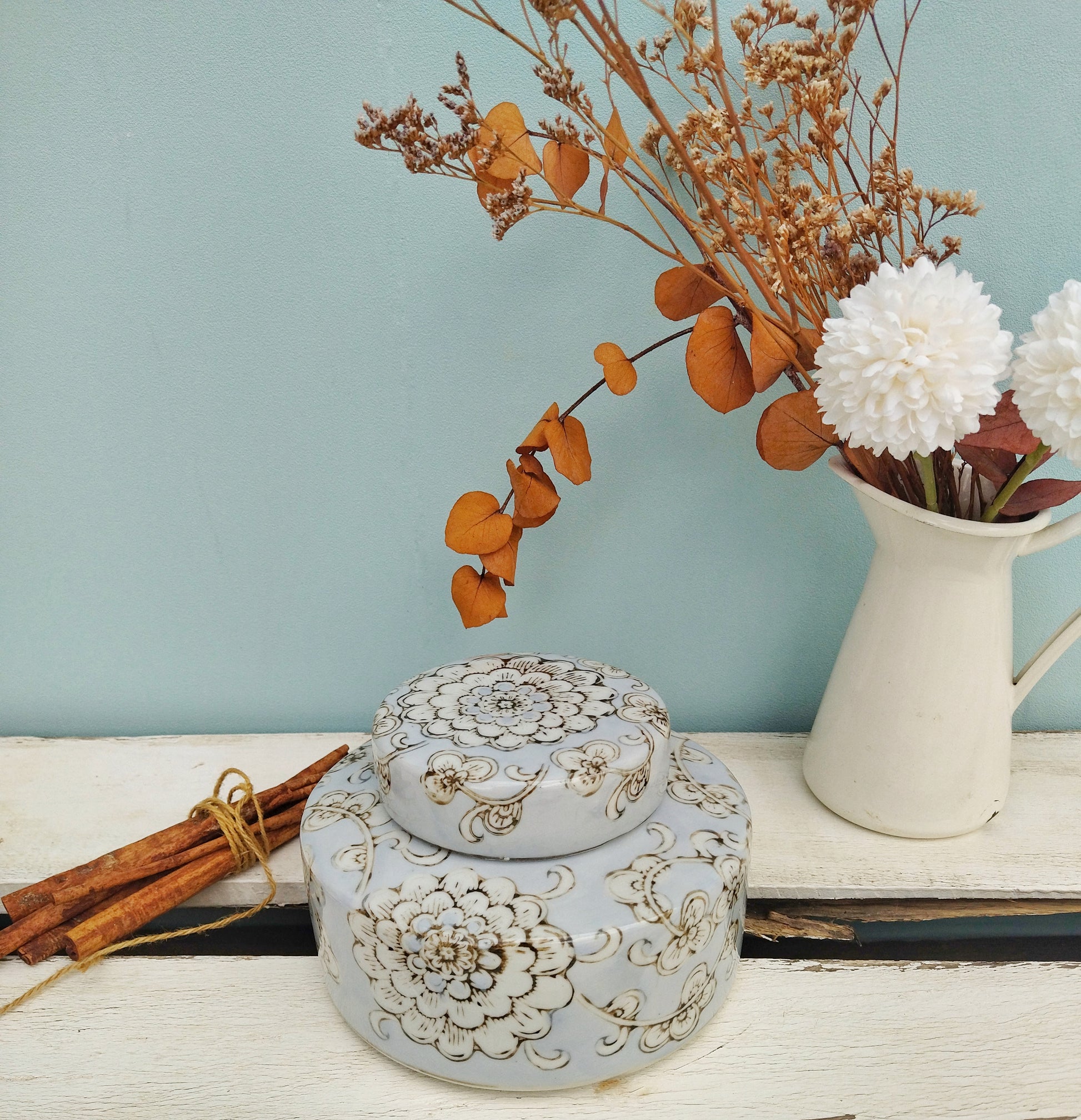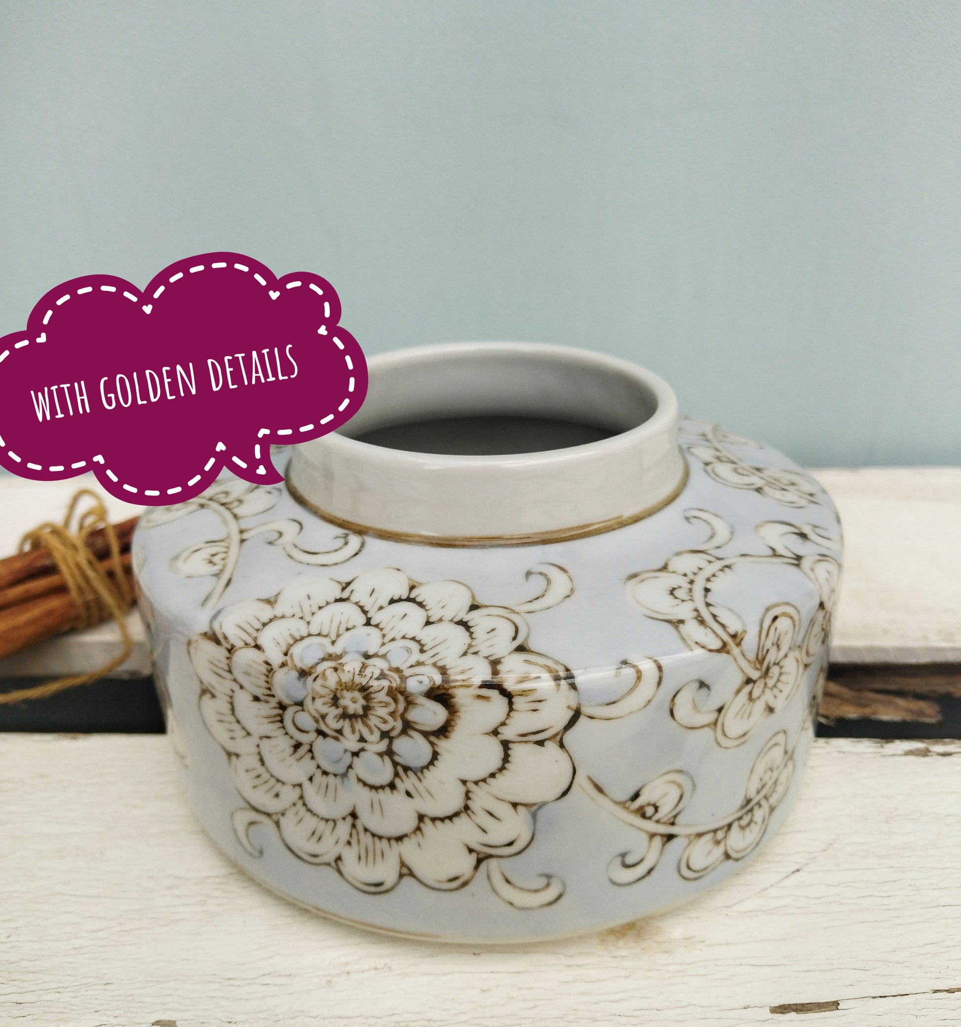 Beautiful ceramic jar with led.. Handmade flower jar with beautiful peony design. Large enough to be a sea salt cellar to your kitchen or a bath bob jar for your spa decor!