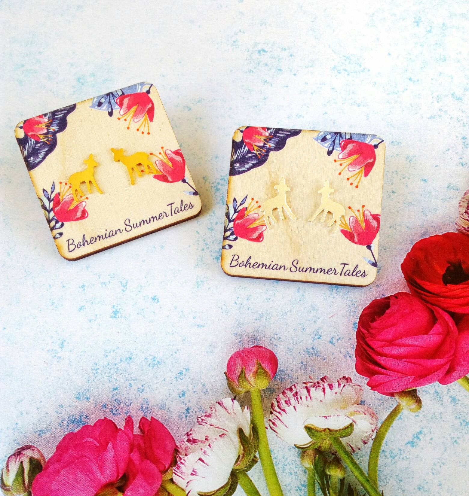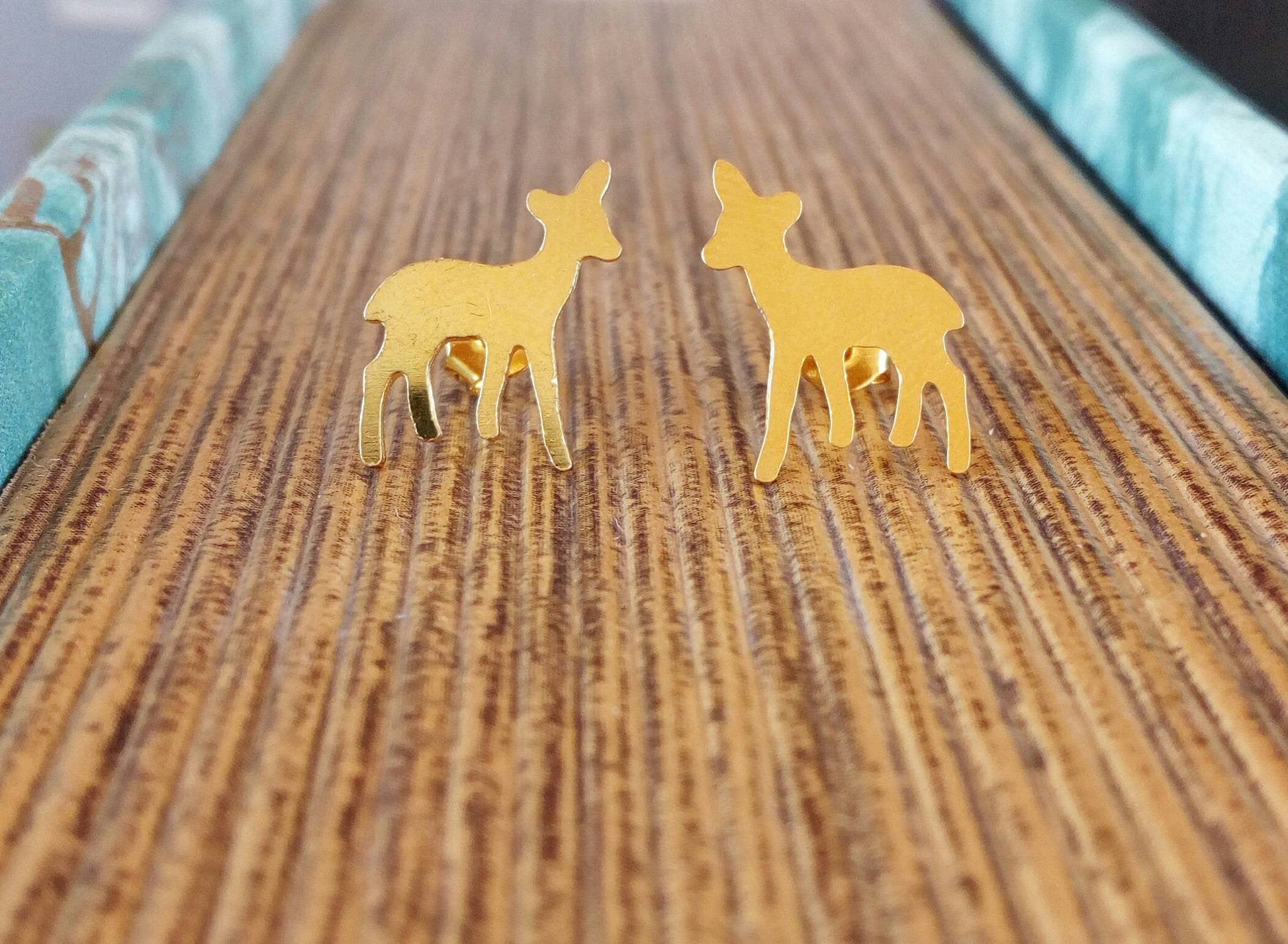 Deer earrings made of silver plated brass. These woodland earrings are cute, modern and elegant! A pair of hypoallergenic stud earrings, nickel, lead and cadmium free. Perfect piece of everyday minimal earrings, easy to match with all your outfits. It comes to you on our eco friendly wood stand.