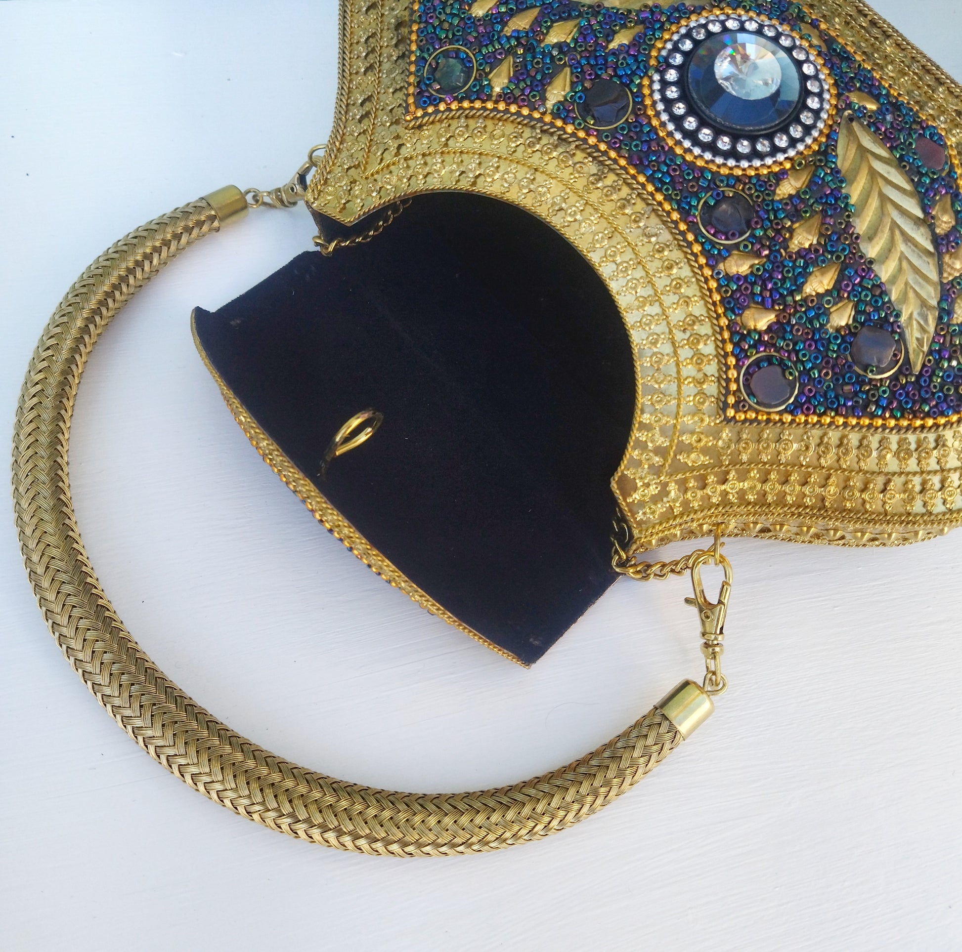 This luxury ornate bag comes with a long brass chain so it can be worn as a shoulder bag, but you can also tuck the chain inside and it still will clasp shut making it also a clutch bag perfect for evenings or just hold it from her beautifully made handle. The interior has a soft black lining and the fastening is so strong that the bag will not open unless you want it to. It comes inside our handmade velvet dust bag for protection.