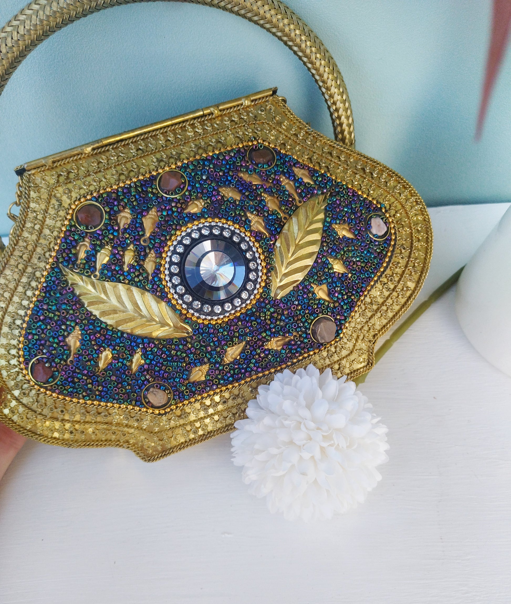 Fancy beaded evening bag with an antique ethnic tribal detailing with a subtle pop of blue and black stonework. The front and back of the bag have different detailing so you can actually wear it showing off the detailing of your choice.
