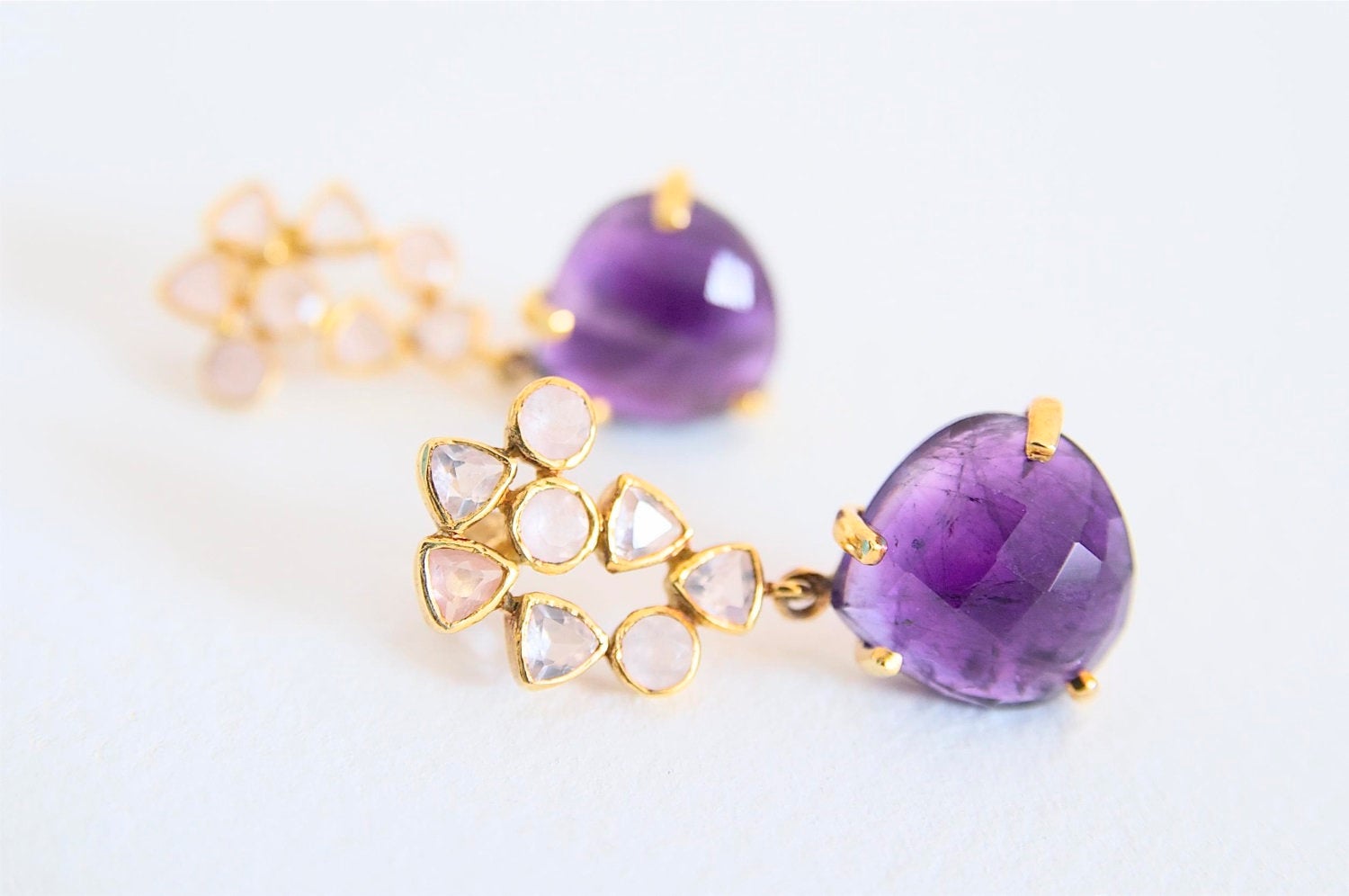 These divine gold amethyst earrings are a reason by themselves, for everyone to stop breathing by your entrance! Magnificent cocktail earrings in 18k gold plated silver. A unique piece of luxurious jewelry, with handsome glossy amethyst stones with intriguing matrix in pear cut. Additionally, 8 Small pink quartz gemstones of top quality decorate the upper part of the earrings. An exquisite example of jewelry craftsmanship! We send them to you in our original package, ready to be gifted.