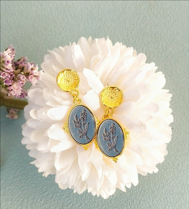 These beautiful gold and dusty blue flower earrings will add a sparkle of elegance to your style! Intaglio jewelry is perfect for any woman who wants to add a touch of sophistication to her look. These drops feature a delicate engraved floral pattern and are surrounded by a gold bail, adding a touch of glamour. Their posts are made of titanium in order to prevent allergies.