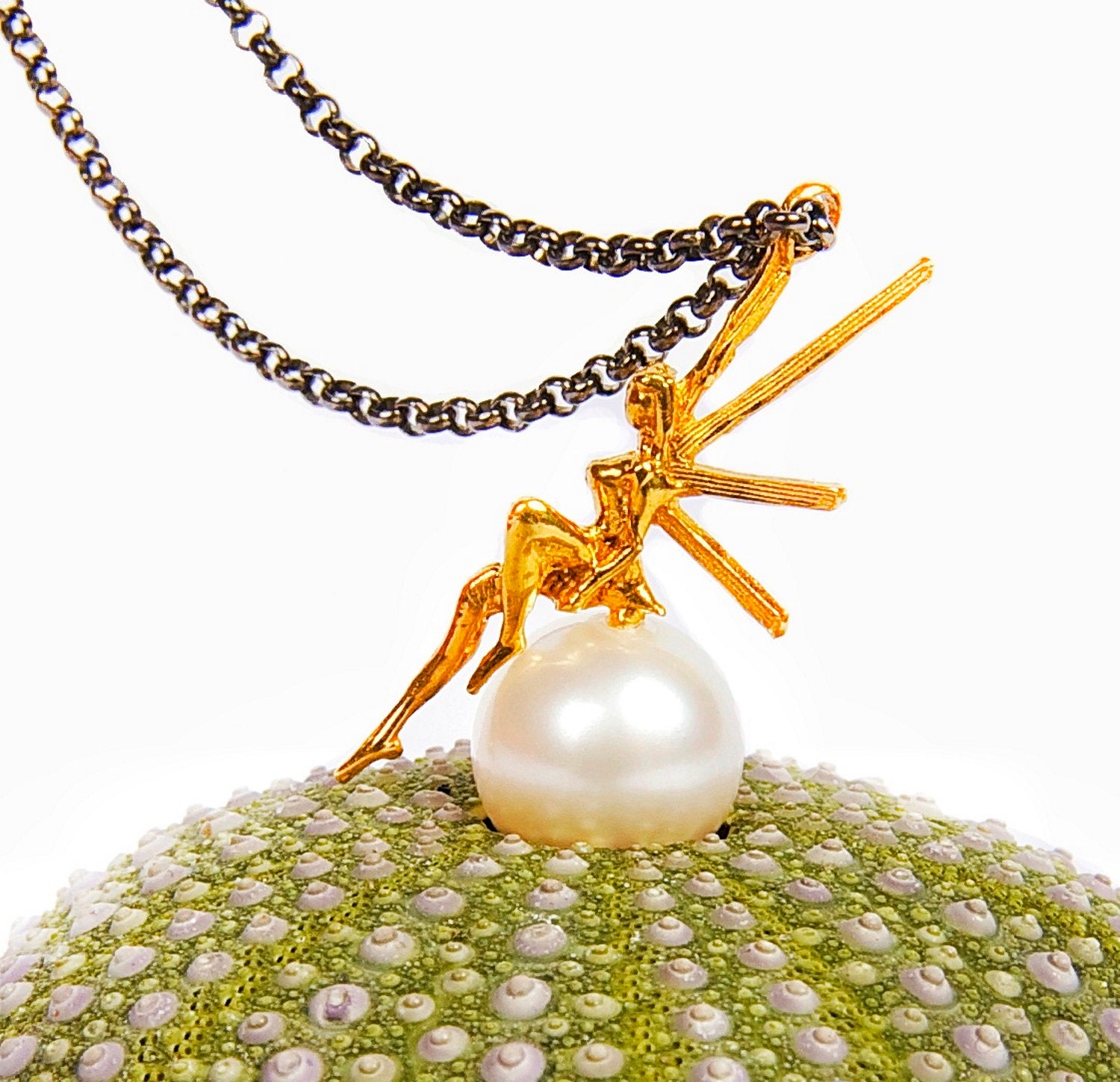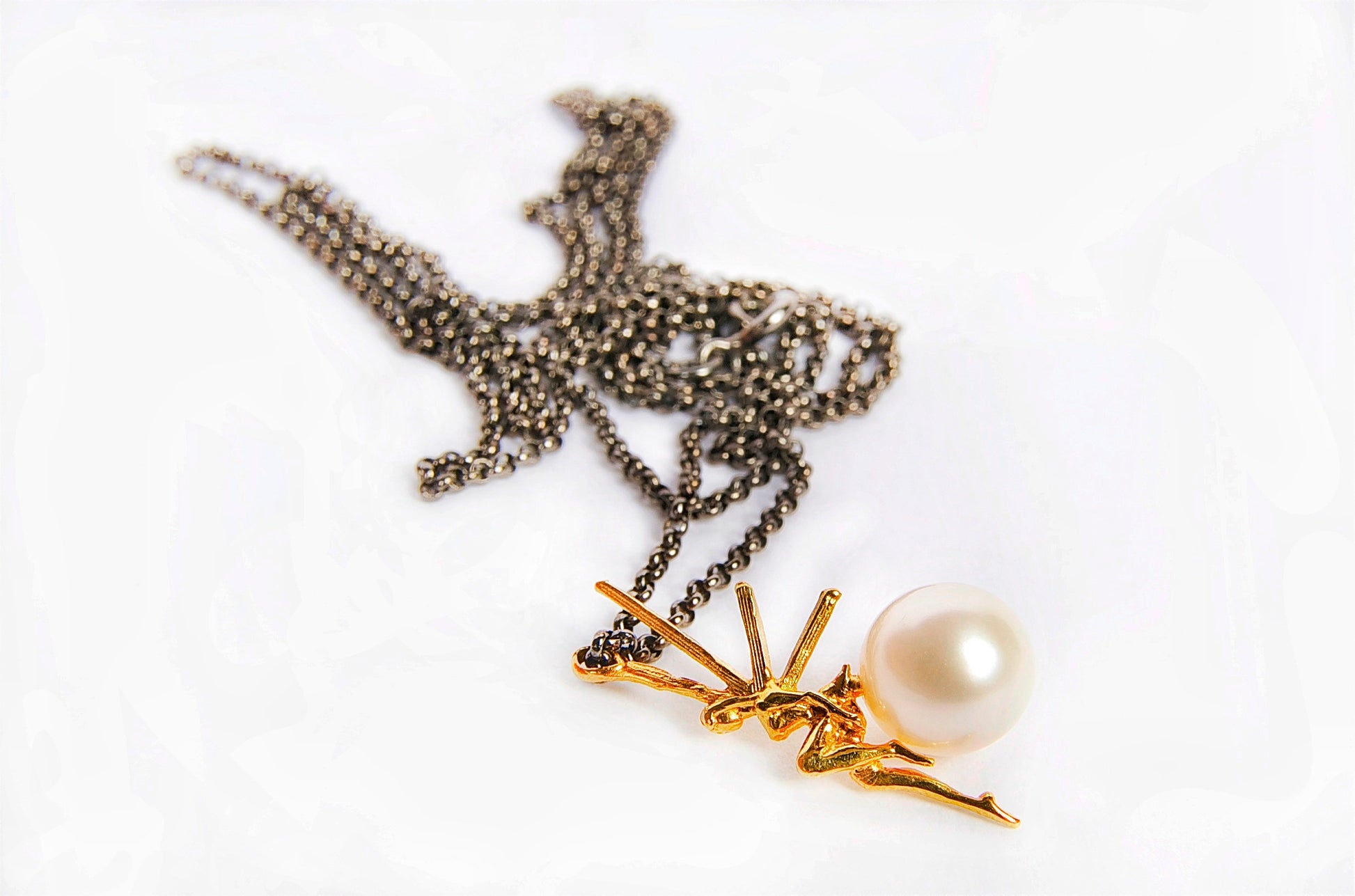❊ Fairy Material: 14k Real Gold ❊ Chain Material: 925 sterling silver, black plated ❊ Charm Size: 2.5 cm * 1,1 cm / 0.98*0.43 inches ❊ Pearl Size: 1 cm diameter / 0.39 inches