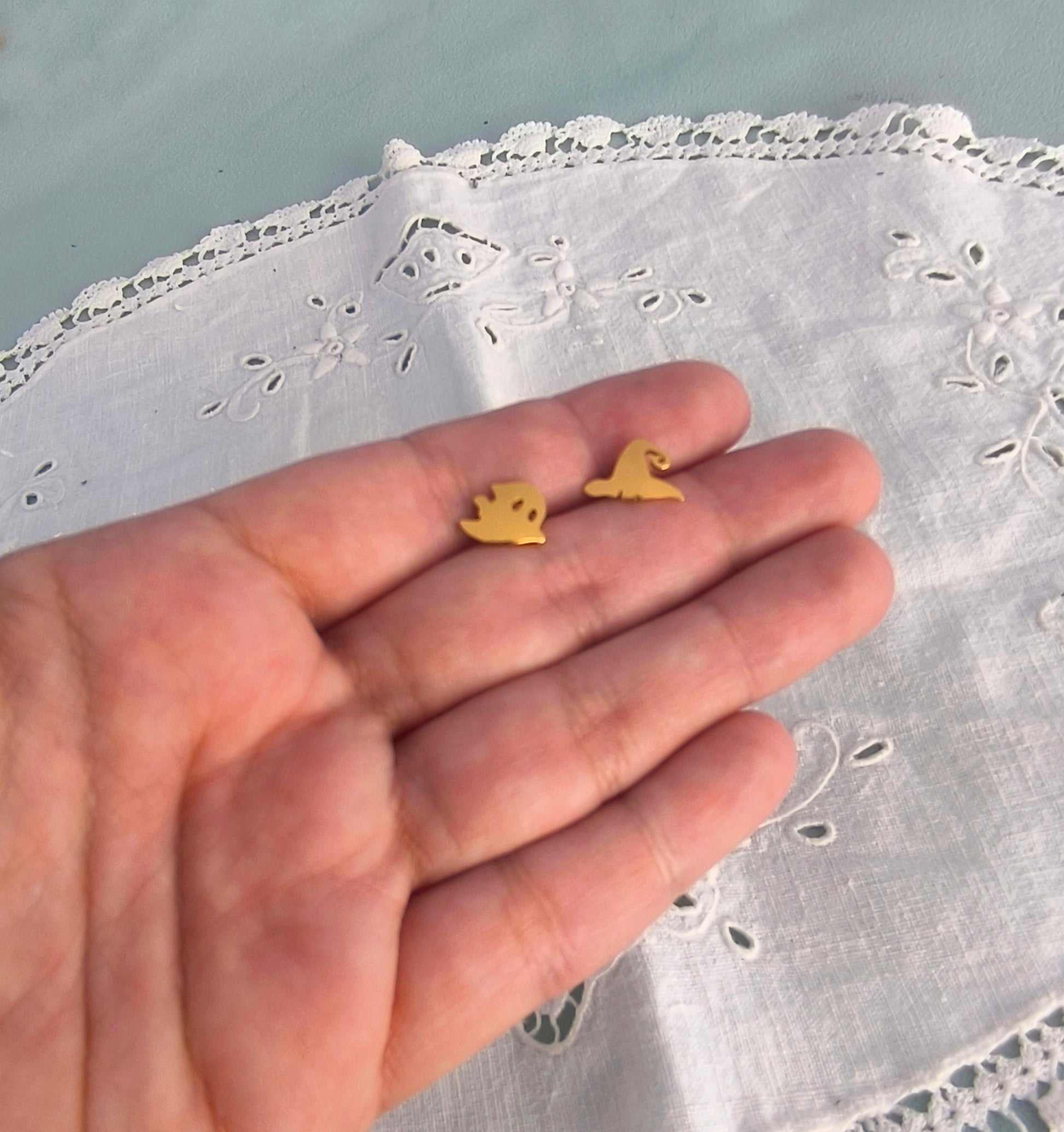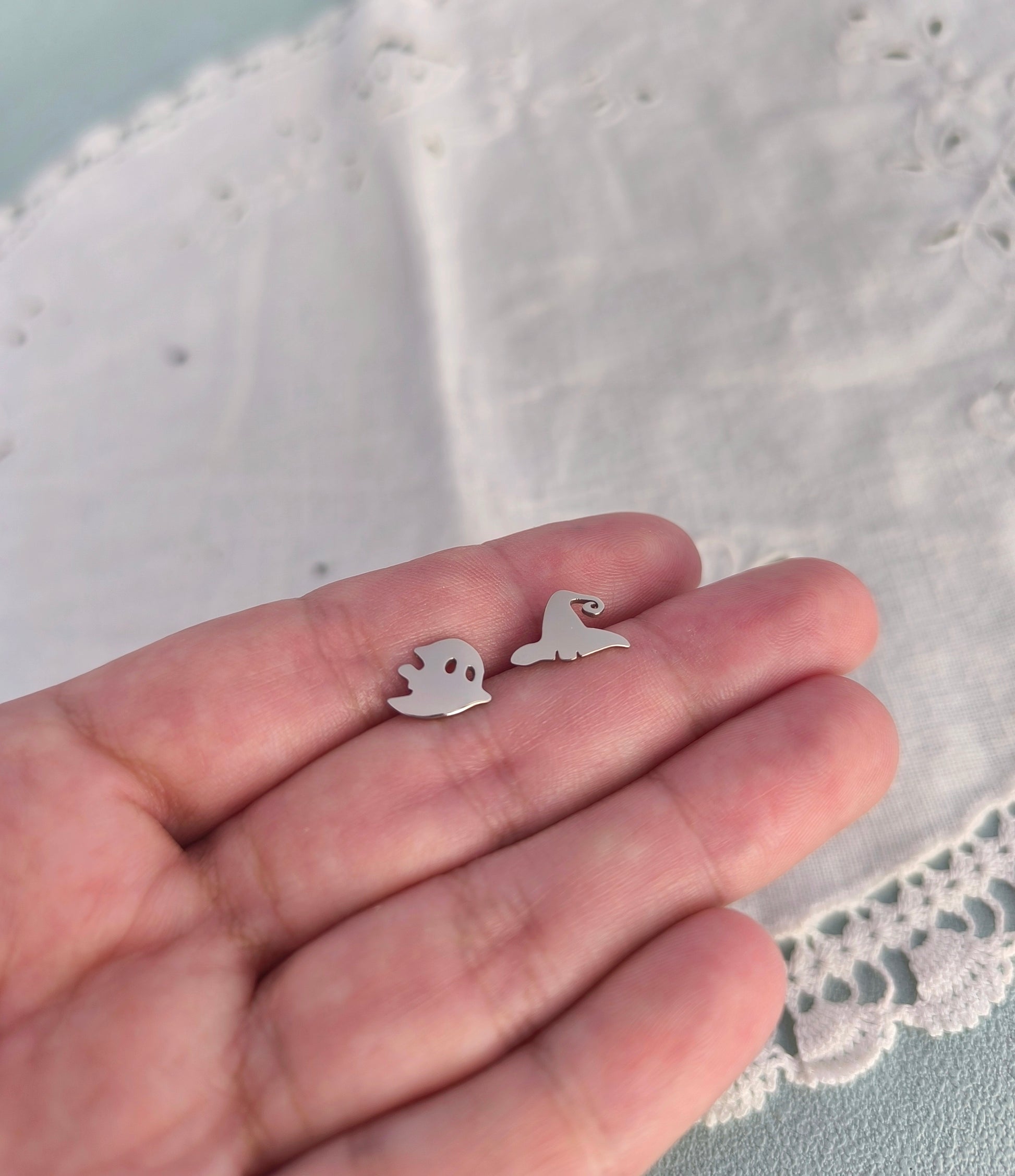 Cute and simple, these mismatched earrings will steal your heart. Get ready for the spookiest time of the year with our Halloween jewelry. Adorable ghost and witch hat stud earrings, made by hand from sterling silver. Choose the color you prefer from the scroll bar.