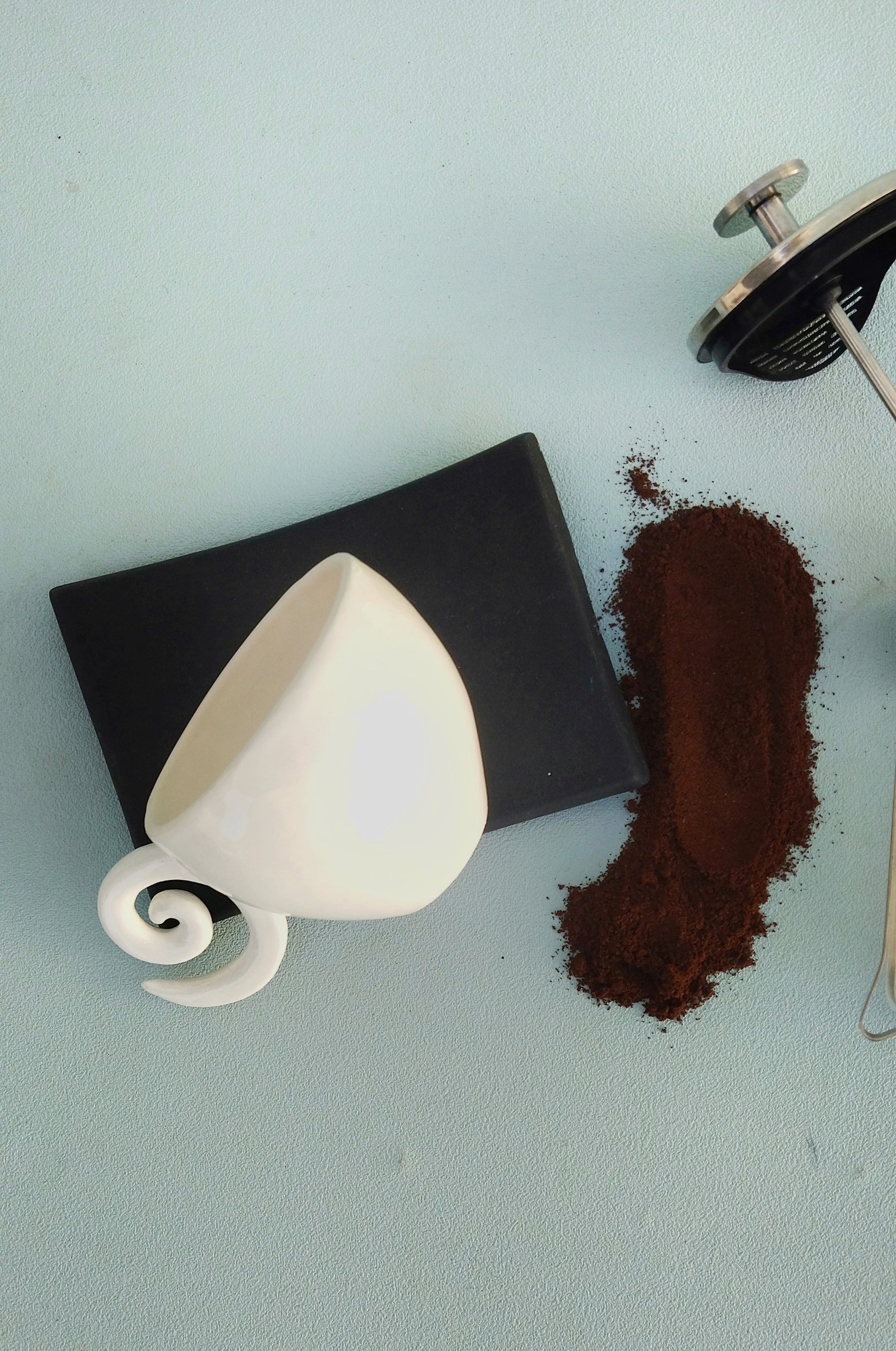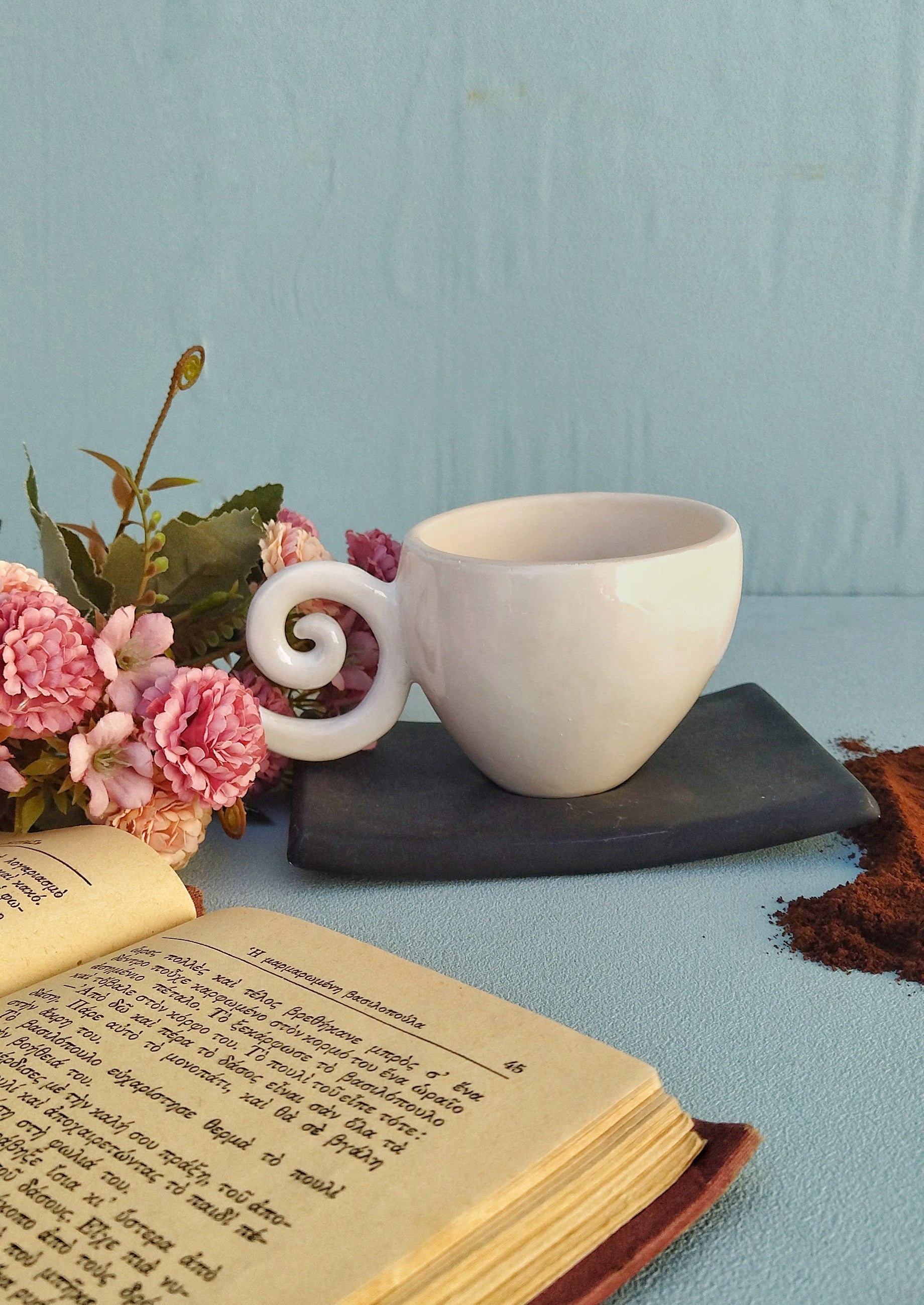 Handmade Coffee Mug, White Ceramic Mug With Black Saucer