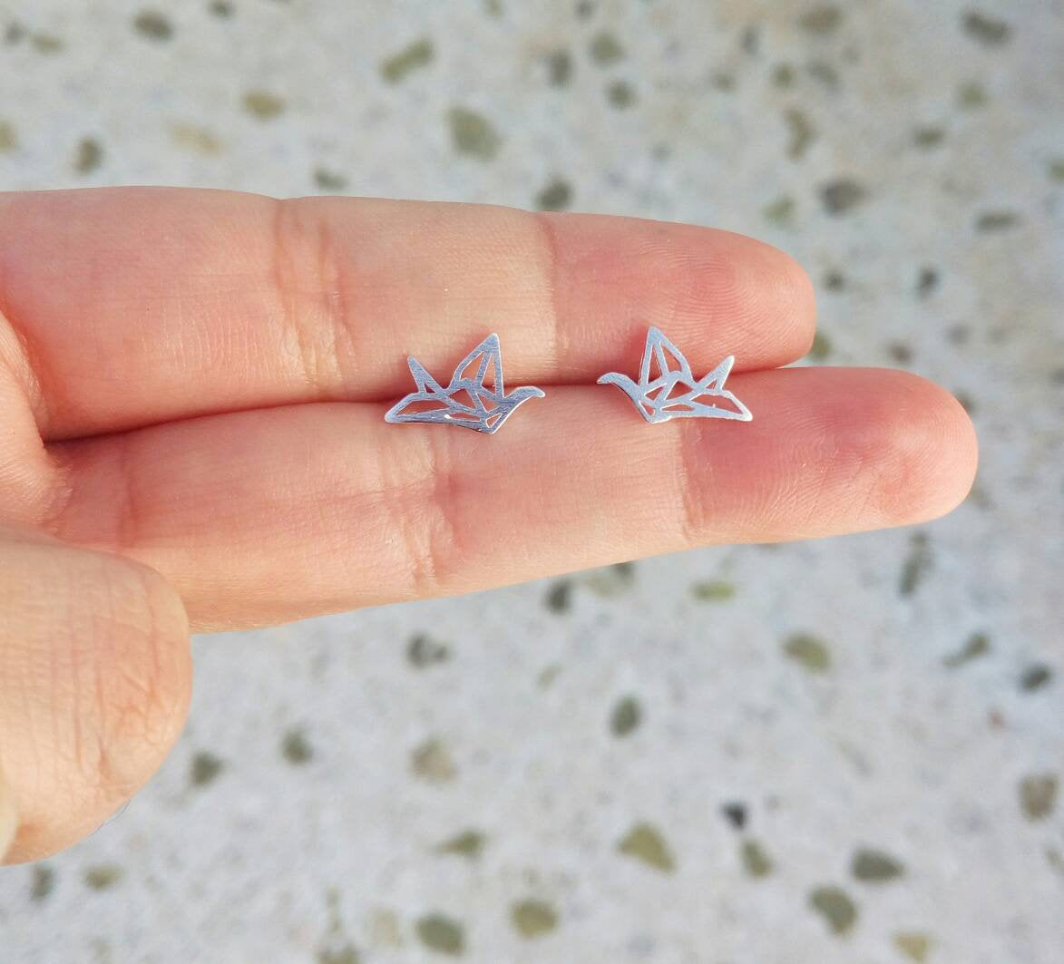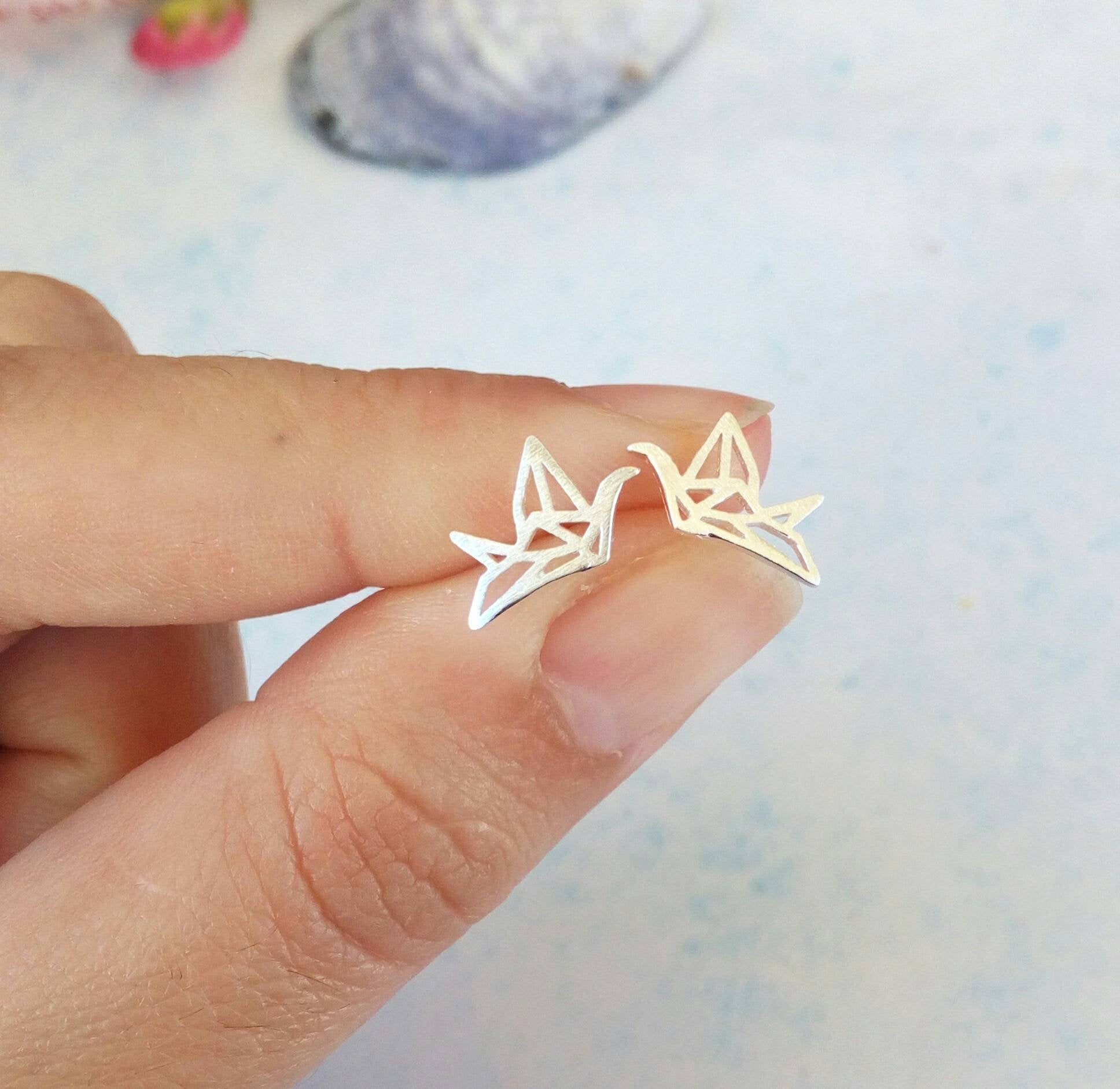 Origami Crane Earrings, Tiny Silver Studs, Japanese Gifts For Her
