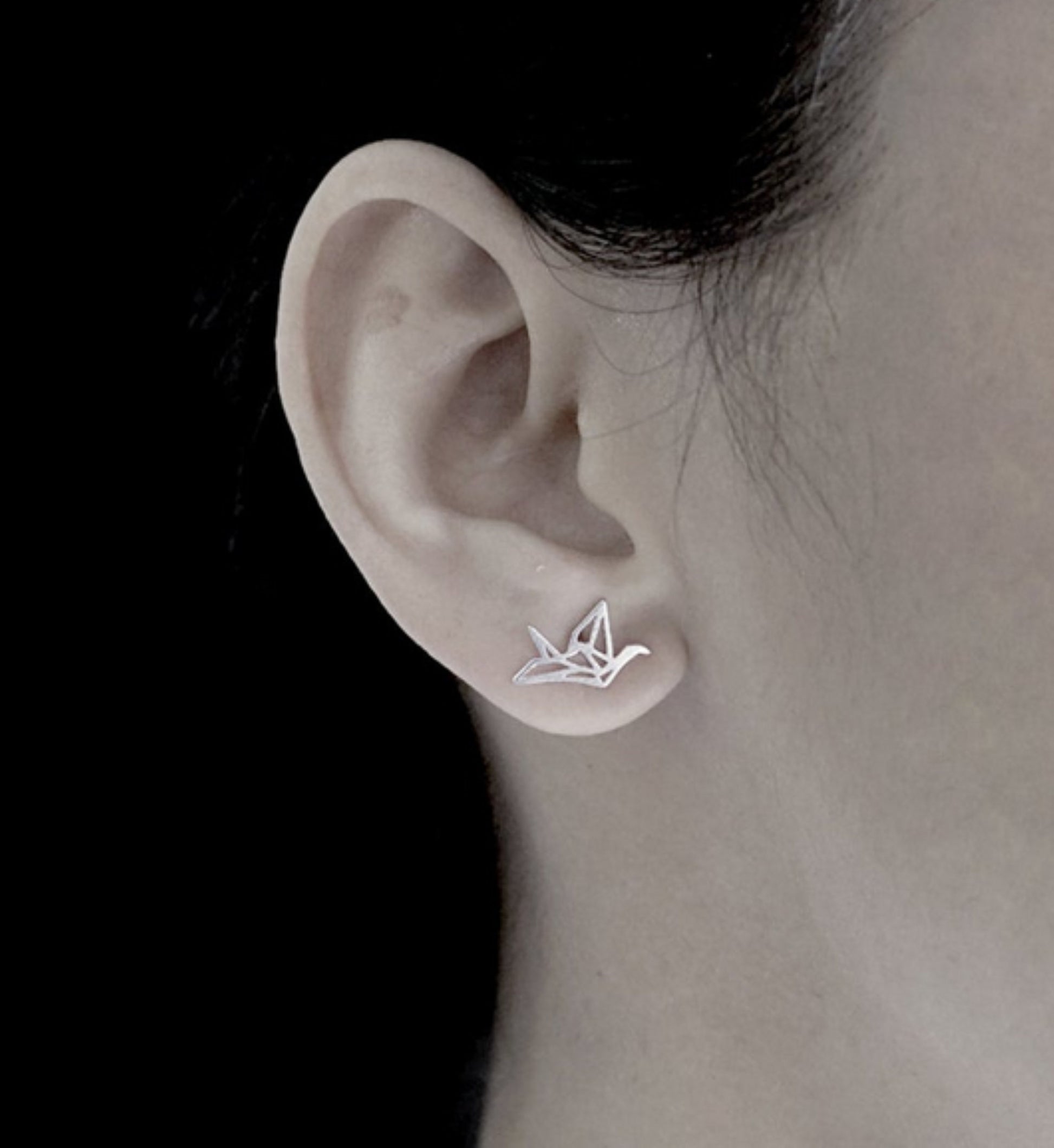 Origami crane earrings made of sterling silver. These bird stud earrings are cute, modern and elegant! A pair of geometric studs for every day! Easy to match with all your outfits. The crane is the most popular bird in Japanese culture and is rumored to live for a thousand years. It symbolizes hope and healing and is believed to bring good fortune. It comes to you on our eco friendly wood stand.
