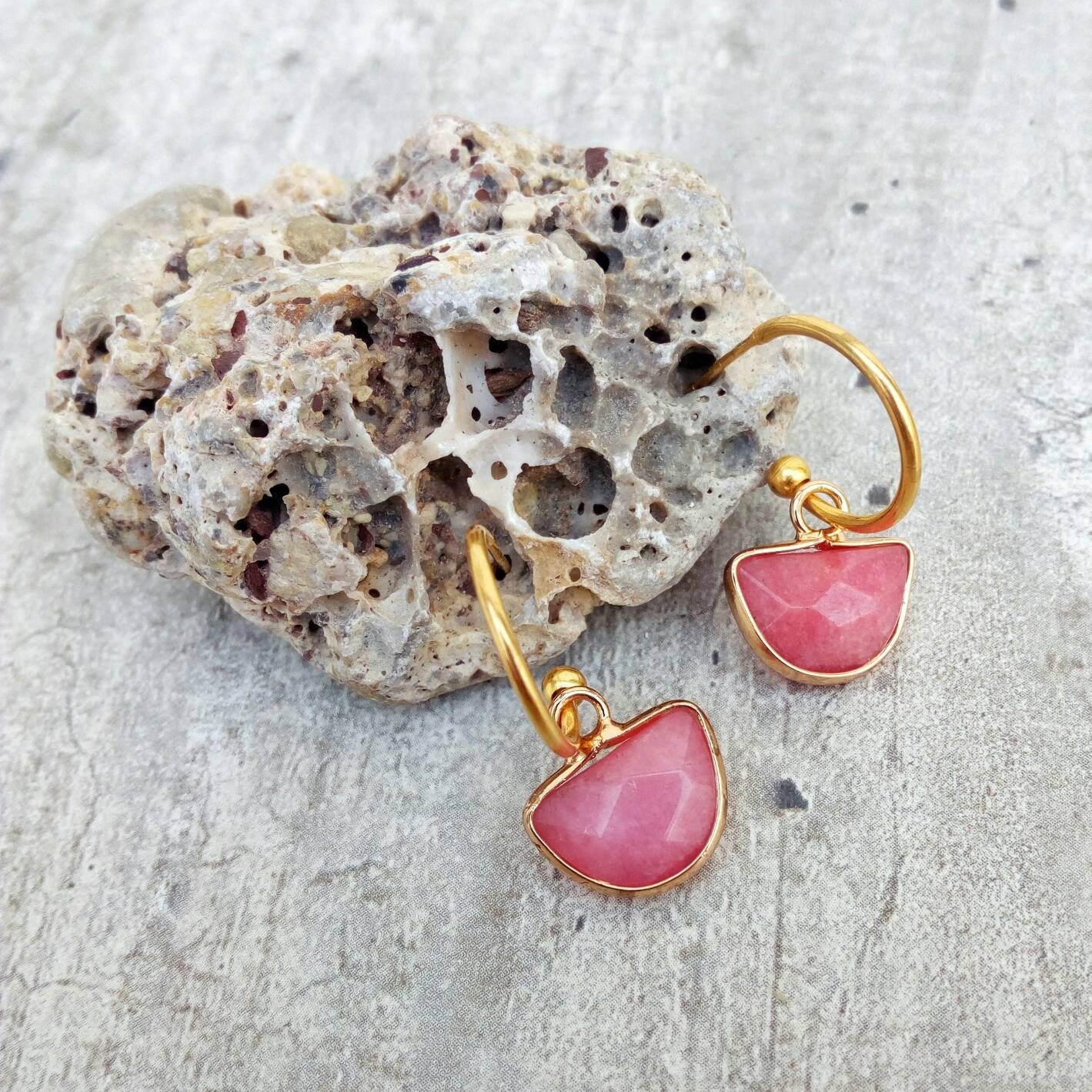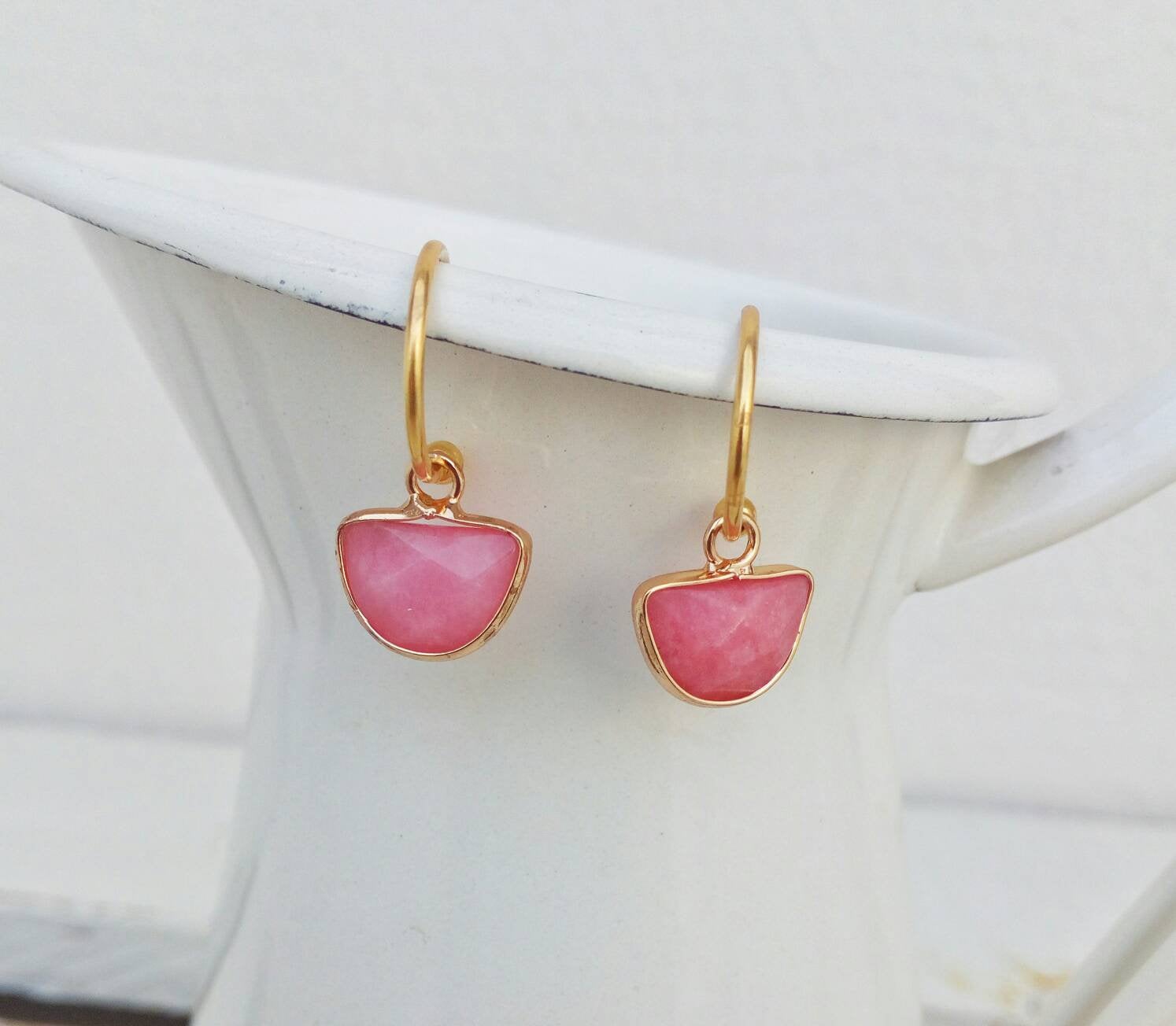 Pink Gemstone Hoop Earrings, Jade Earrings, Minimal Hoops Gift For Her