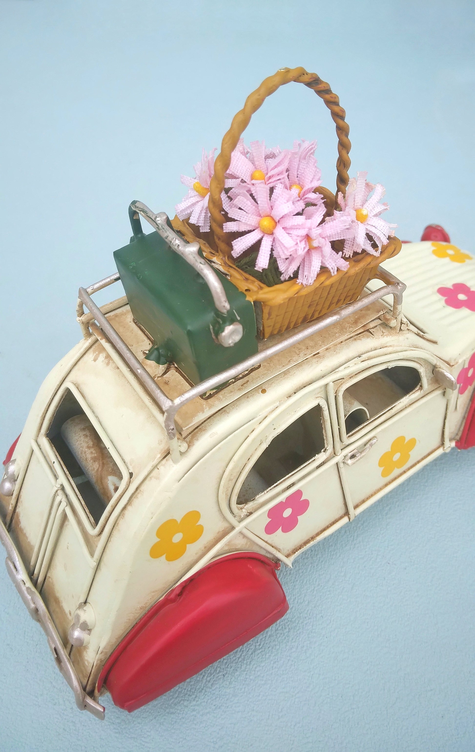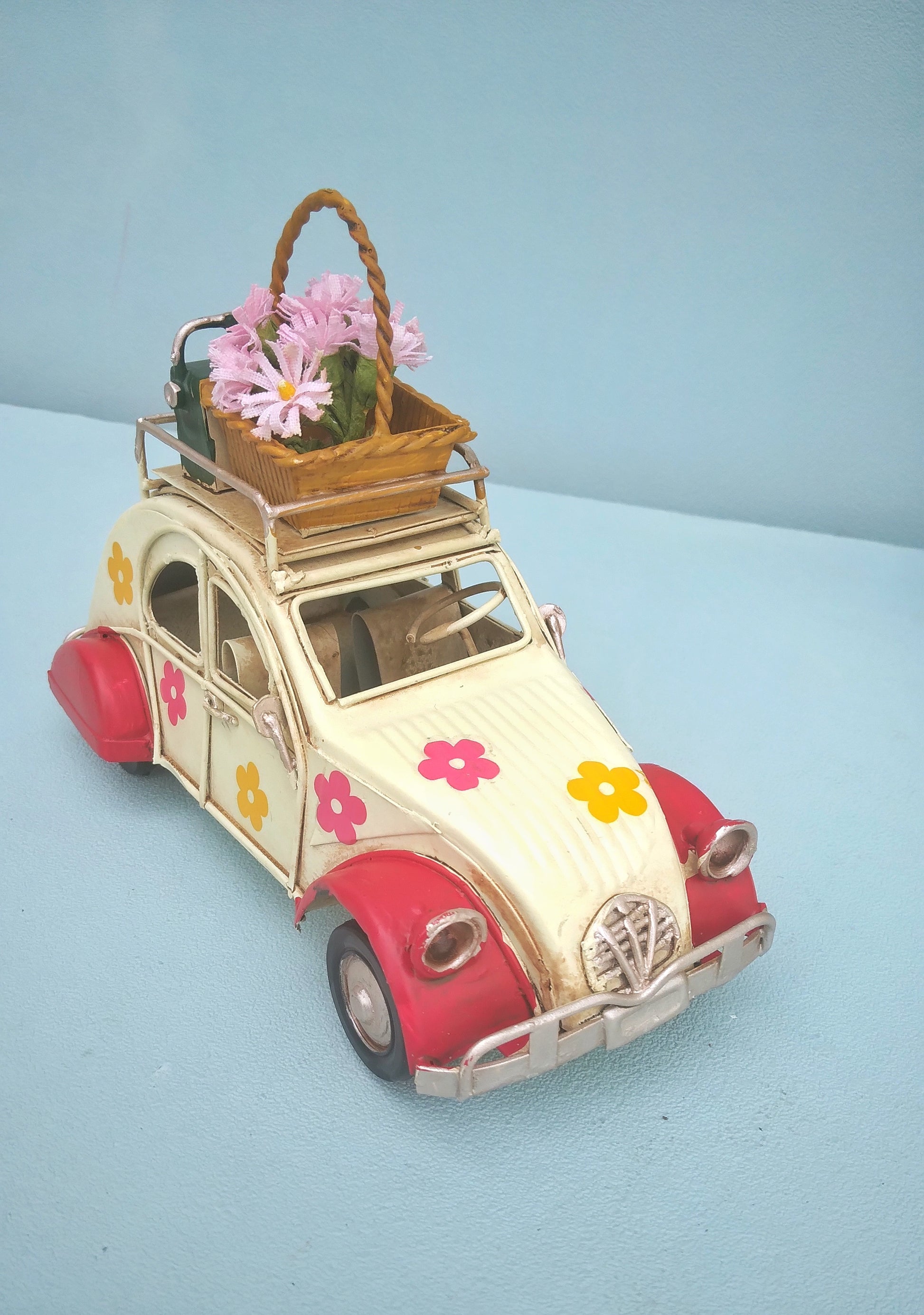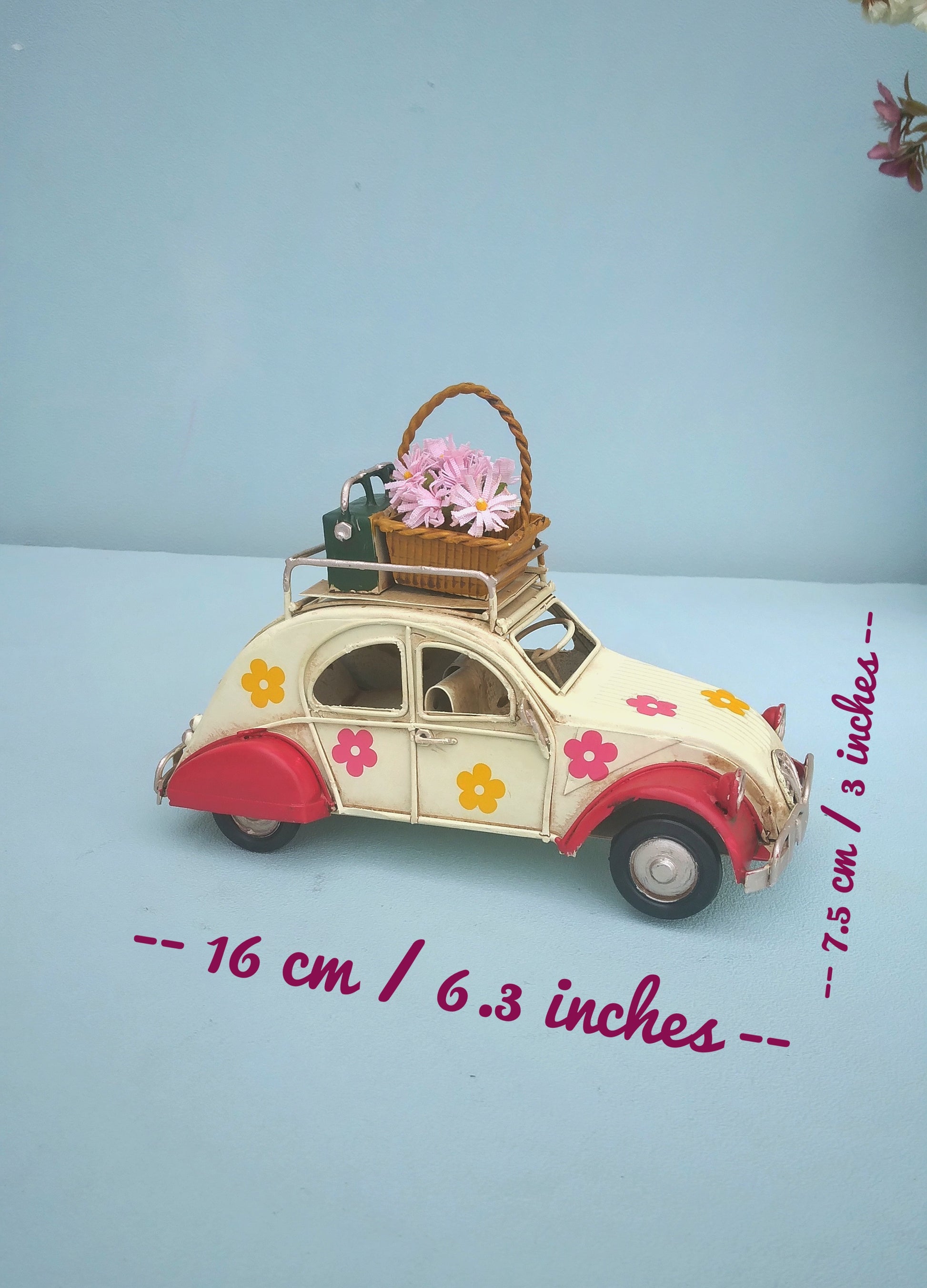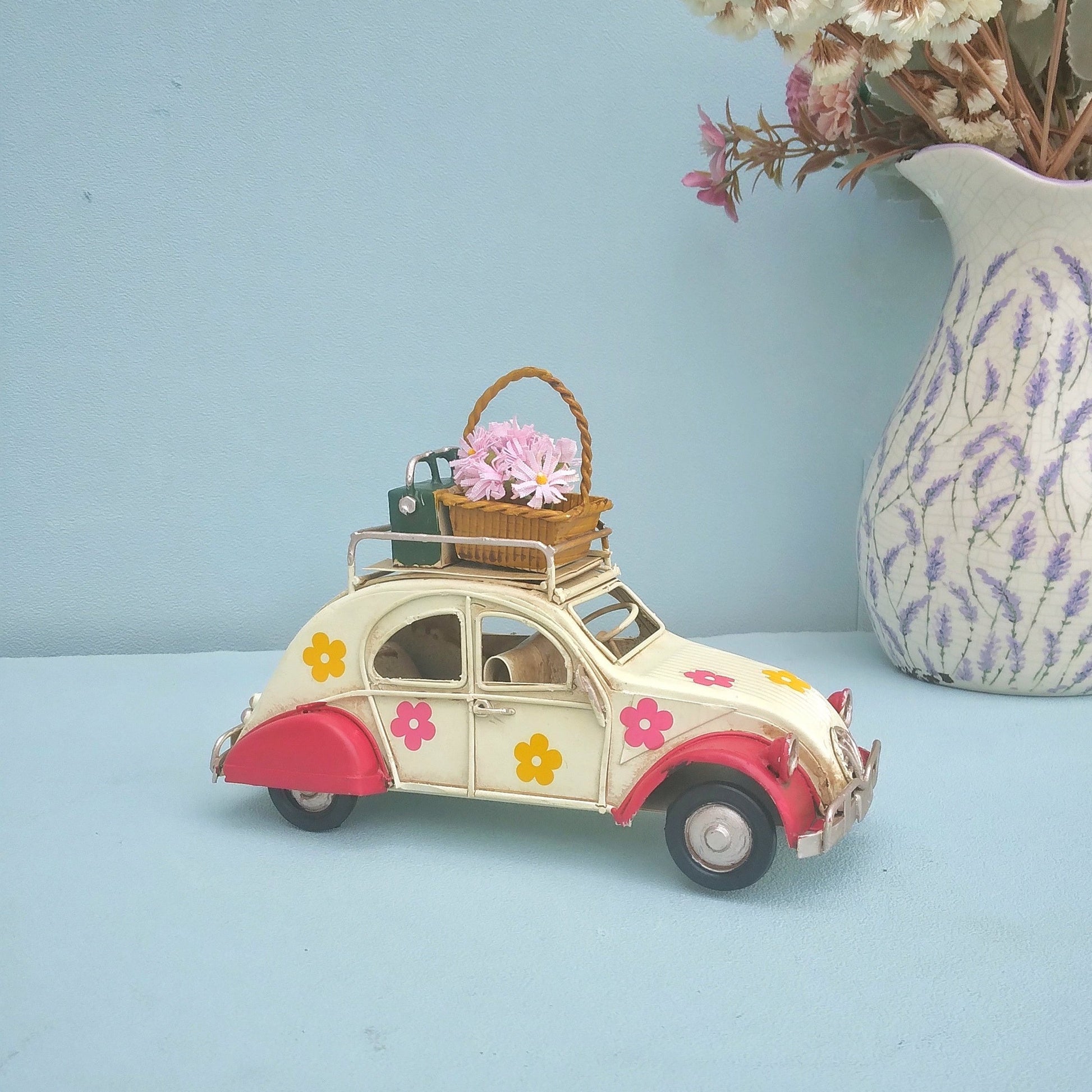 Retro Citroen 2 CV Metal Car With Baggage Rack And Flower Basket, Vintage 70s Style Beetle Car