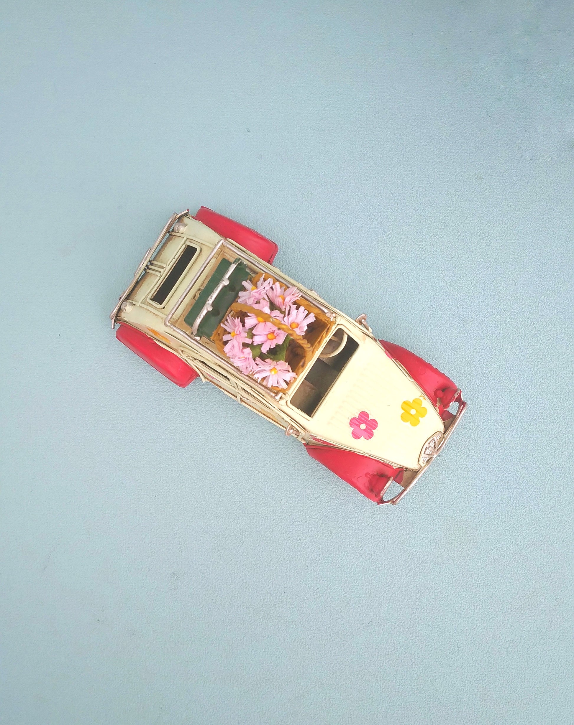 Made entirely by hand from metal, it is the perfect garage decor! A cute baggage rack on top provides extra space for its flower basket and luggage. The best gift for collectors and kids of any age.