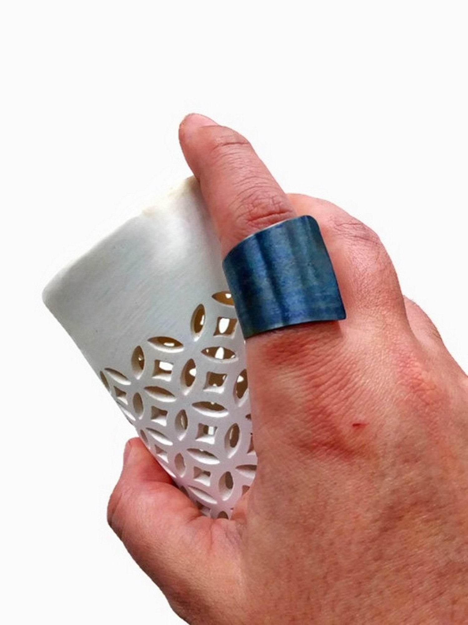 ❊ Material: anodized titanium ❊ Wrap size: in front 3 cm / 1.18 inc | back : 2 cm / 0.78 inch ❊ Ring size : the original size of this ring is 9 3/4 ( FR 60), but it is slightly flexible and can be adjusted to small scale changes.