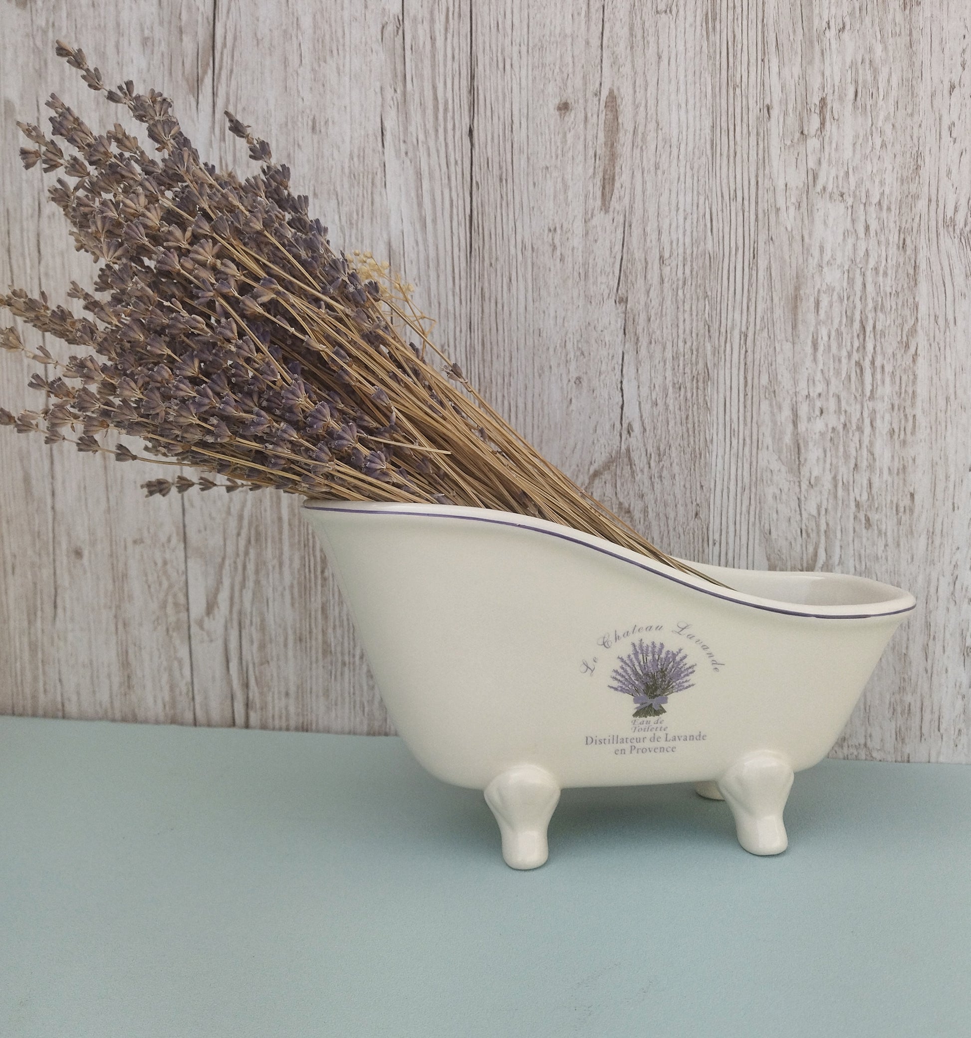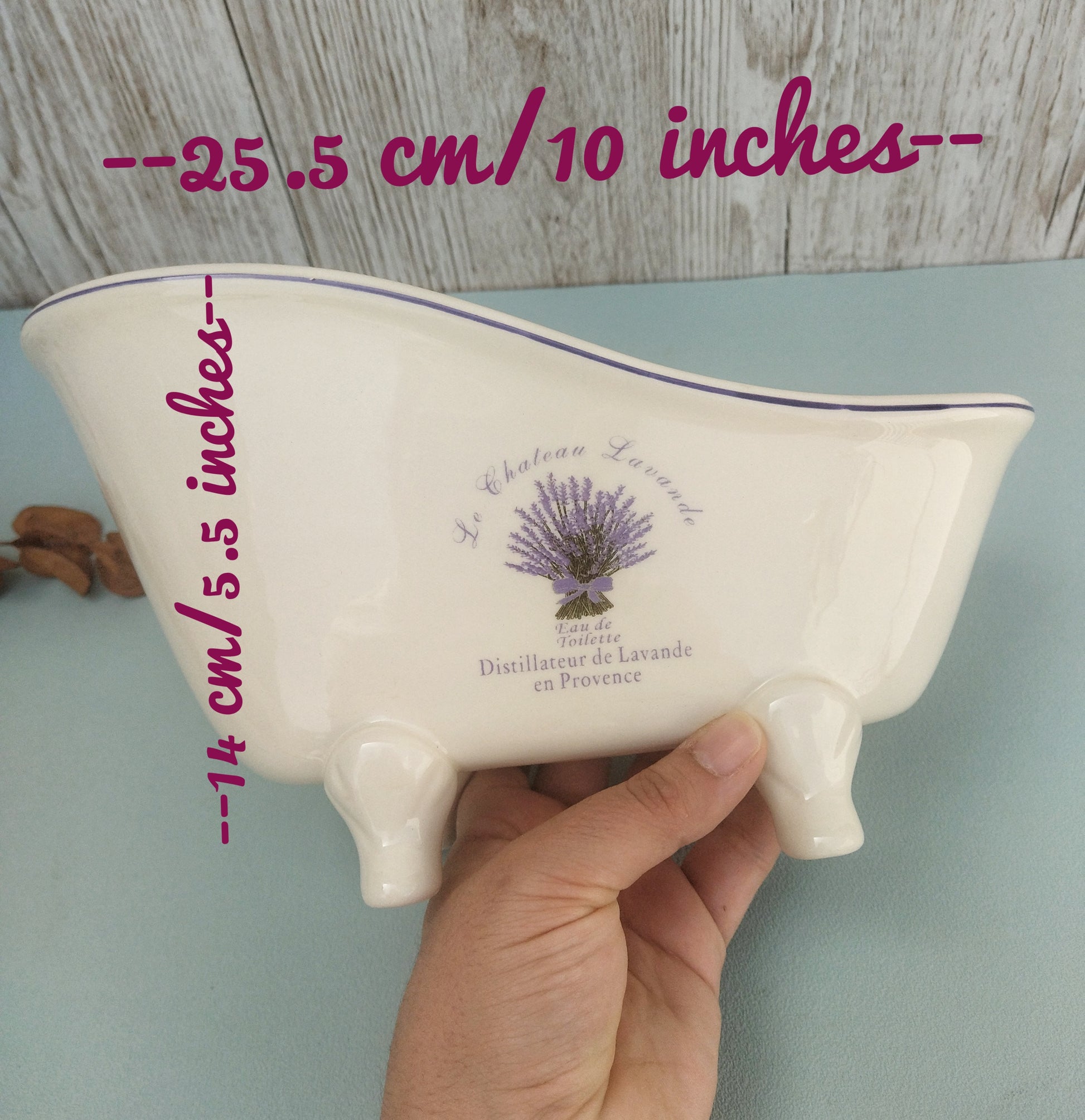 Farmhouse bathroom soap and sponge holder. Beautiful vintage style miniature bathtub in french country style. An adorable lavender bouquet is painted on the ceramic bathtub, giving a shabby chic result. Combine it with our matching pitcher and bowl and create the ultimate nostalgic decor!