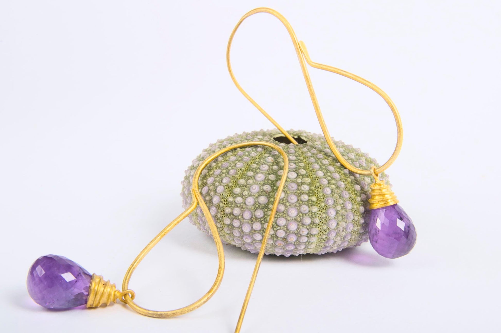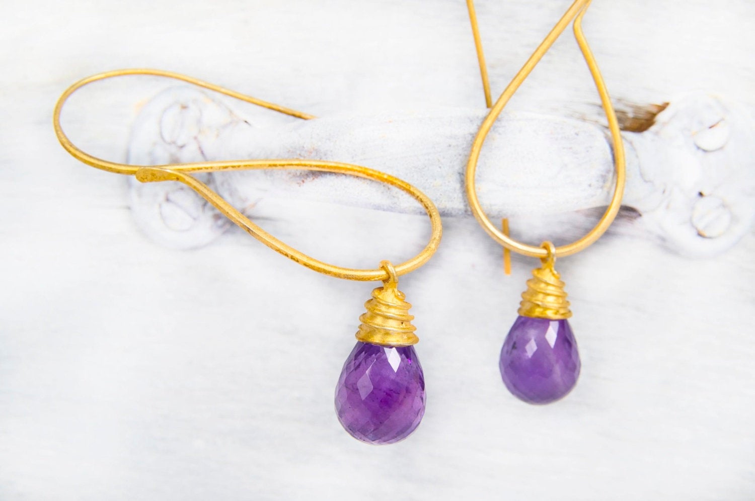 Violet Earrings, Long Gold Amethyst Earrings, 22k Gold Plated Silver Earrings
