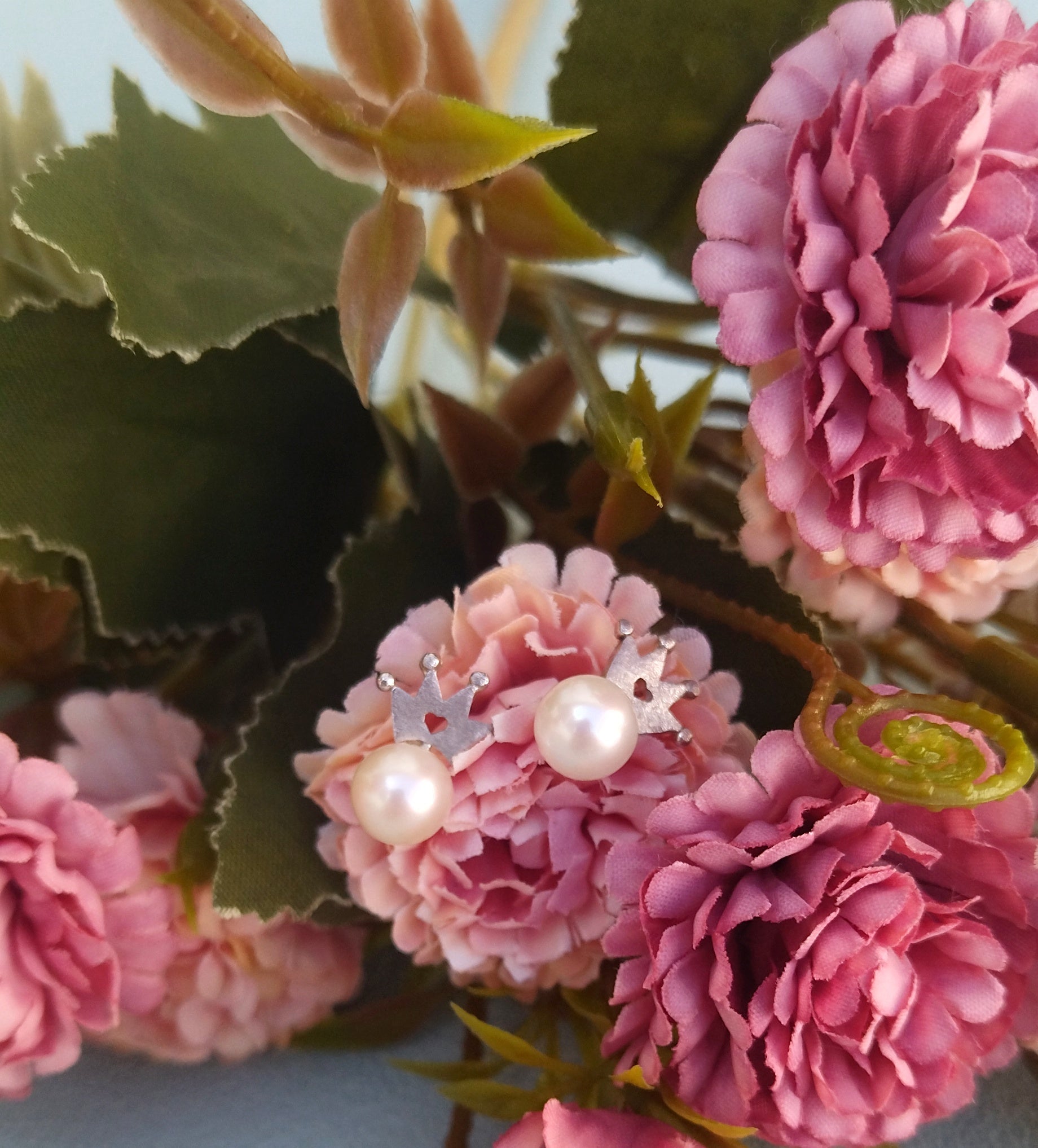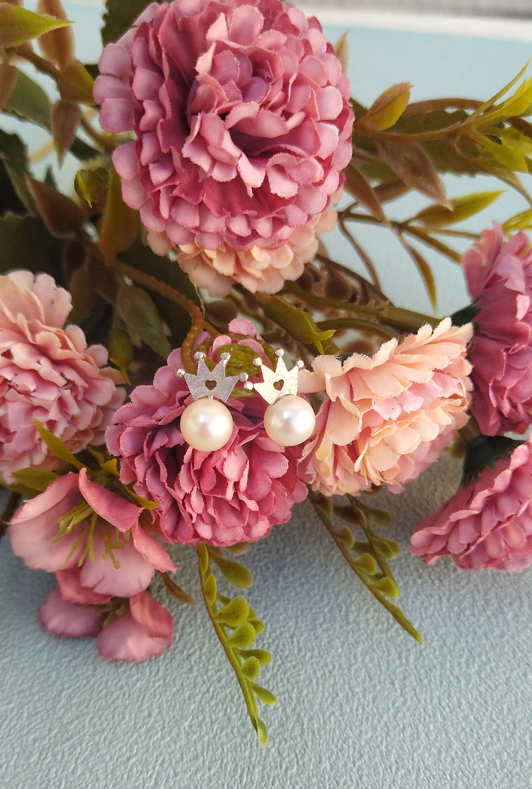 White gold pearl earrings made of solid gold. Ideal bride pearl earrings, they just give an elegant note without being loud. Or a thoughtful gift from dad to daughter as a graduation gift! You can just wear them all day long. With your working clothes for a classic touch or with your evening outfit for an Audrey Hepburn style. Just do not forget your little black dress! White pearls are always classic and suitable for any age. At the center of these crown earrings, I have engraved a tiny open heart, in order to make them even more adorable and meaningful! Every piece has its own certificate that guarantees gold's authenticity