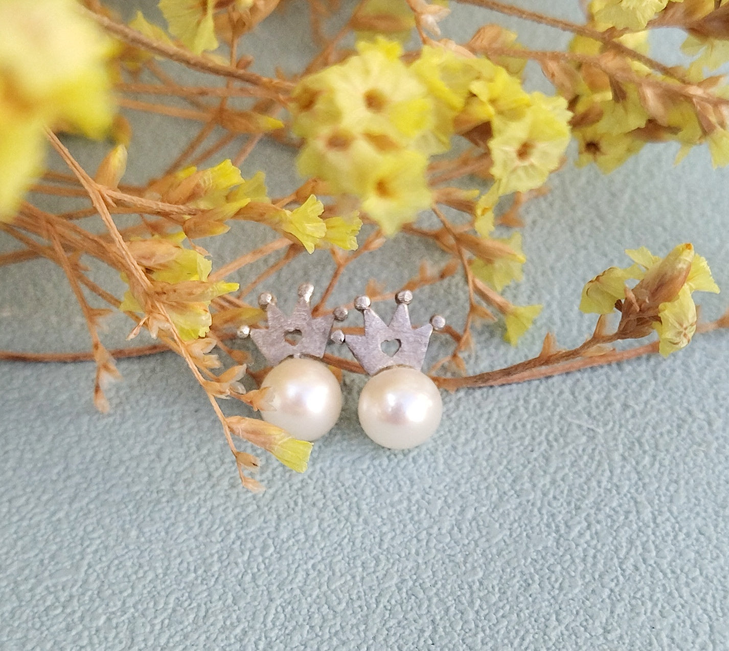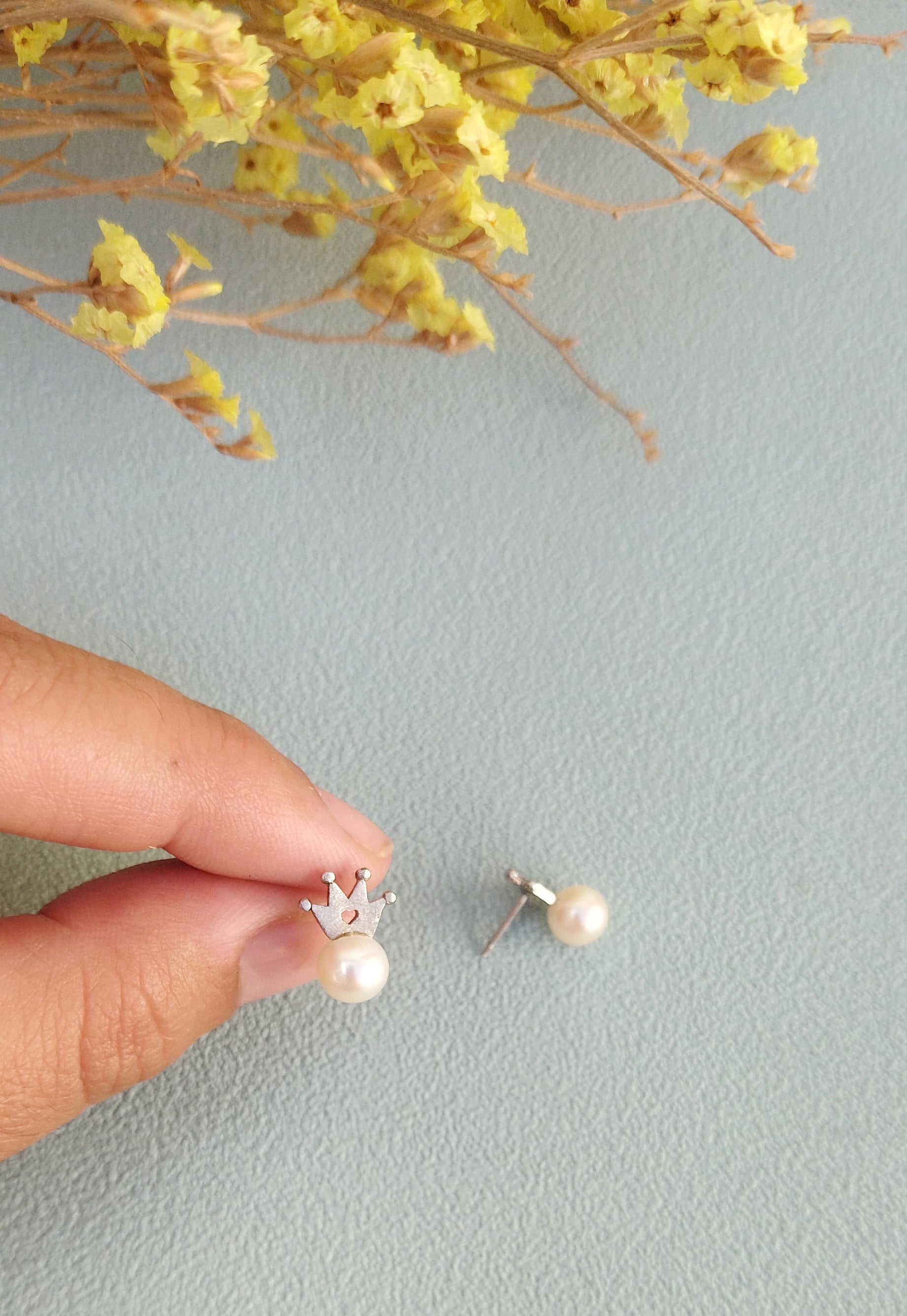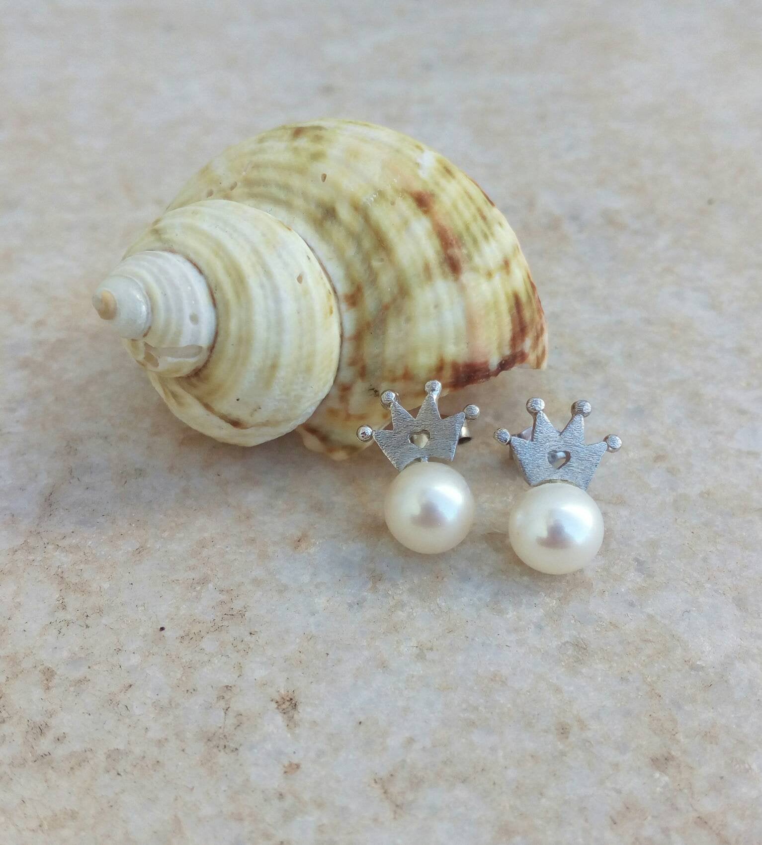 White Gold Pearl Earrings, 14k Gold Crown Earrings For Bride