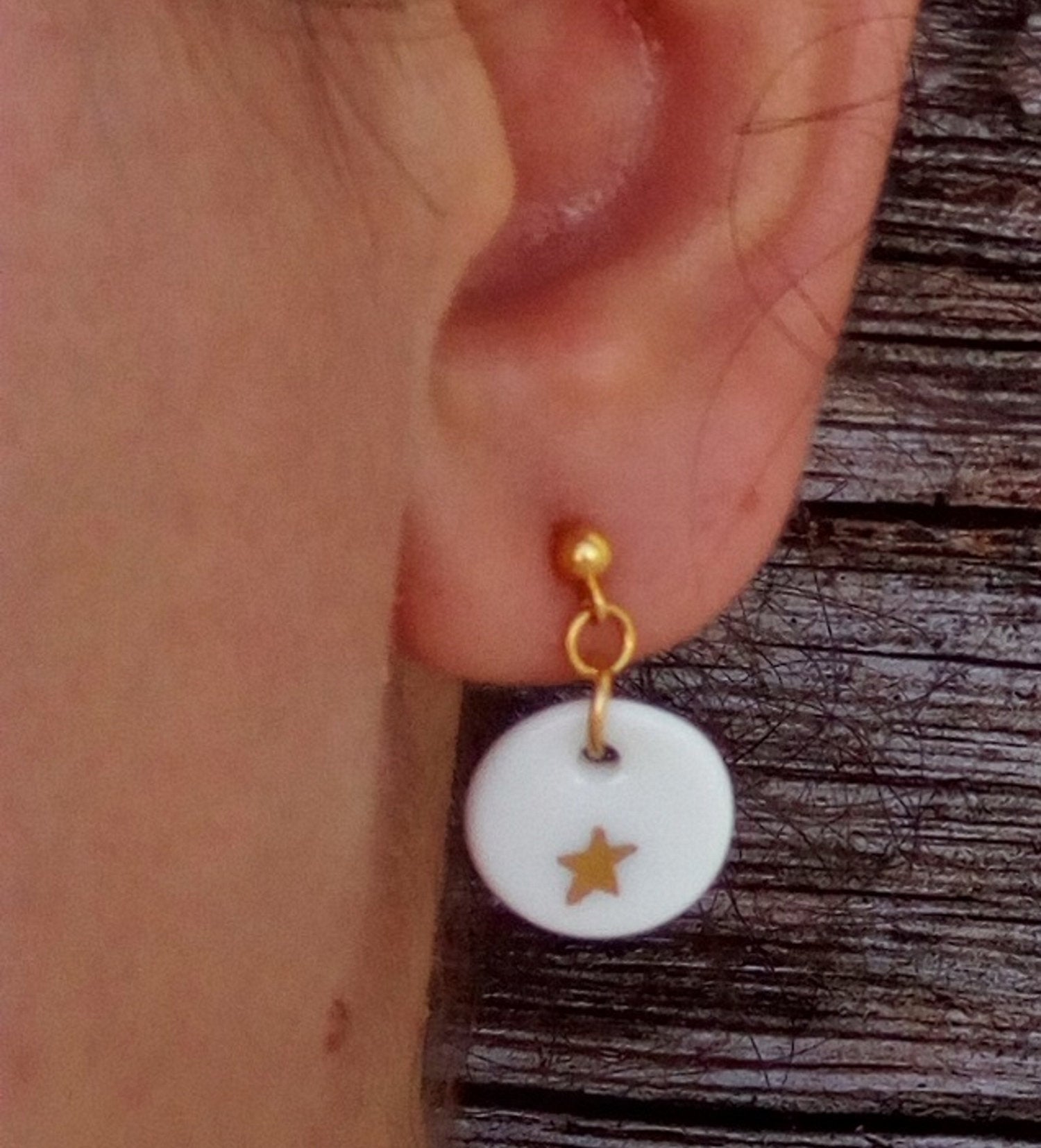 Beautifully handcrafted white porcelain star earrings with a fine thin line of 18k gold leaves.
